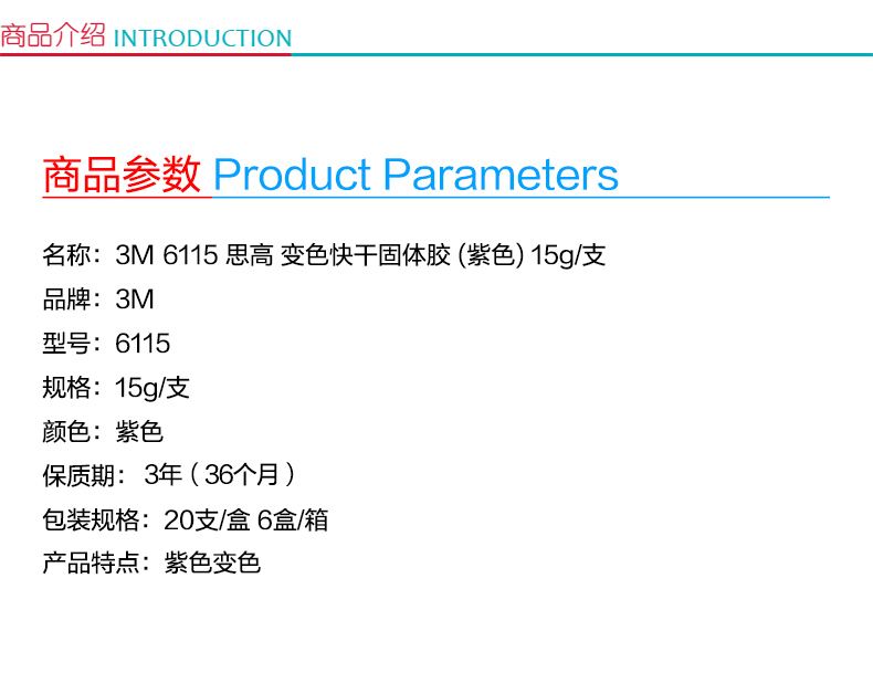 商品属性 [供应商] 科力普科技集团股份有限公司 [保质期] 24个月 [容量] 15g [入数] 1支 [品牌] 3M [型号] 6115 [内包装] 20支/盒