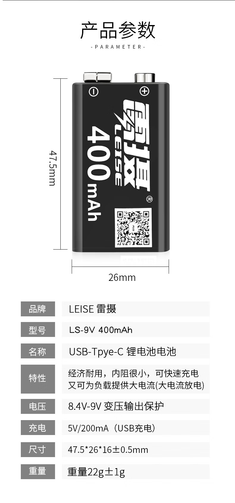商品属性 [供应商] 史泰博(上海)有限公司 [品牌] 雷摄(LEISE) [型号] LS-9V 400mAh
