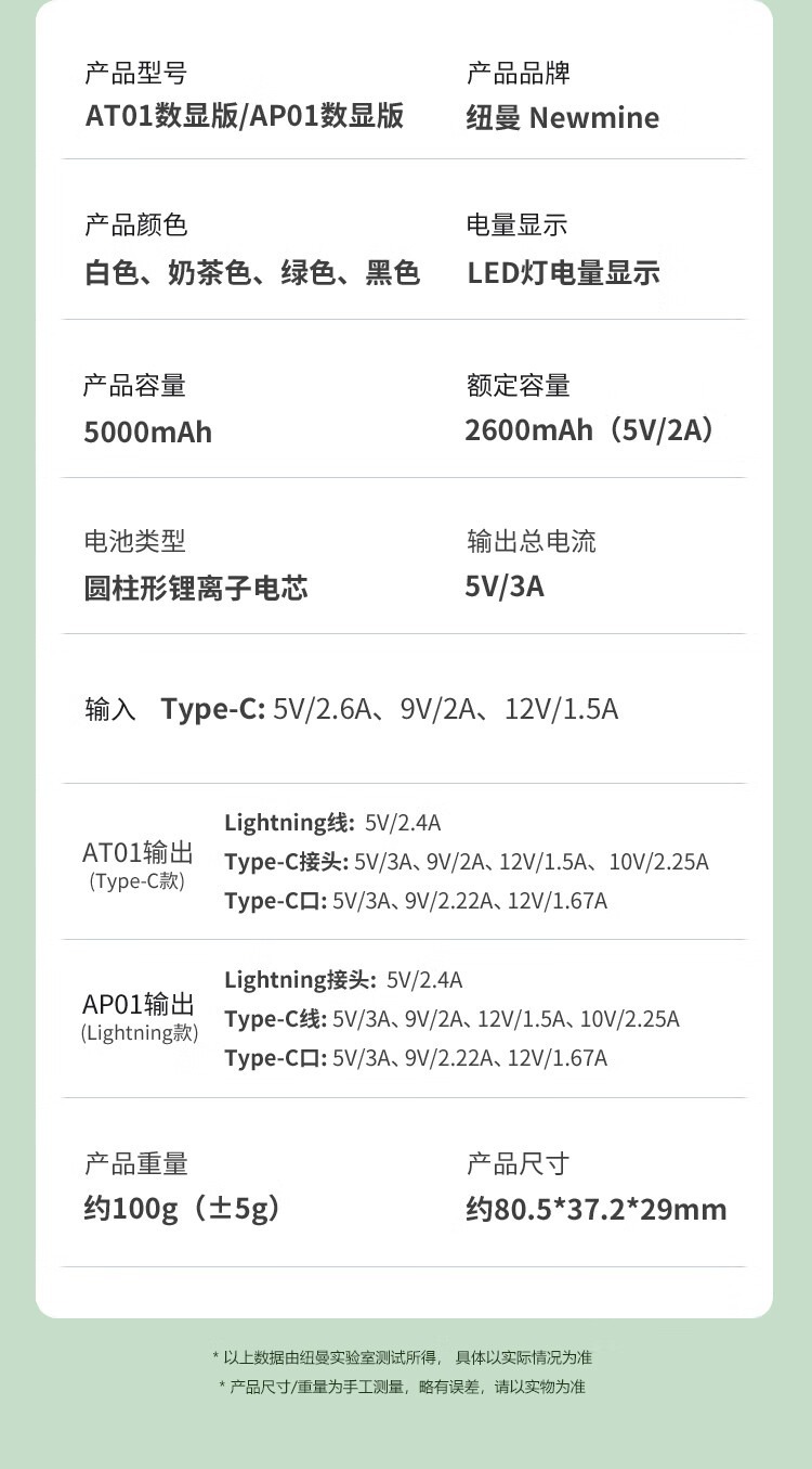 商品属性 [供应商] 深圳市怡亚通供应链股份有限公司 [品牌:] 纽曼(Newmine) [型号:] AT01数显版 [规格:] 22.5W PD20W 5000毫安