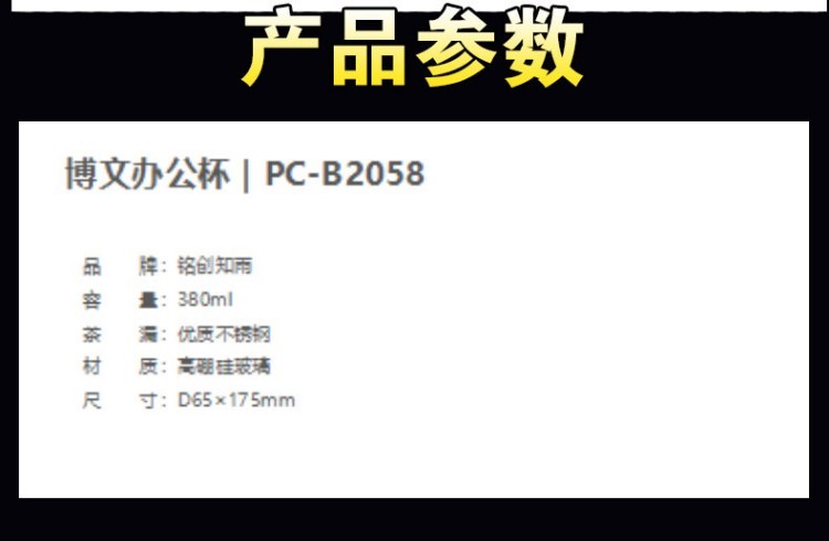 商品属性 [供应商] 深圳齐心集团股份有限公司 [品牌] 铭创知雨 [型号] PC-B2058 [材质] 高硼硅玻璃