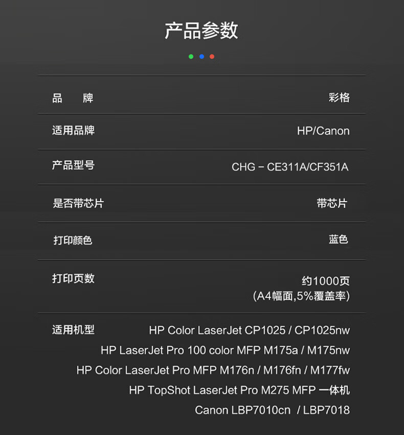 商品属性 [供应商] 德致商成集团有限公司 [打印页数] 1000页 [是否可加粉] 可加粉 [原装/通用] 通用耗材 [包装清单] 蓝色粉盒Plus版(1支) [类别] 粉盒/粉仓 [适用机型] 适用惠普HP Color LaserJet CP1025;CP1025nw