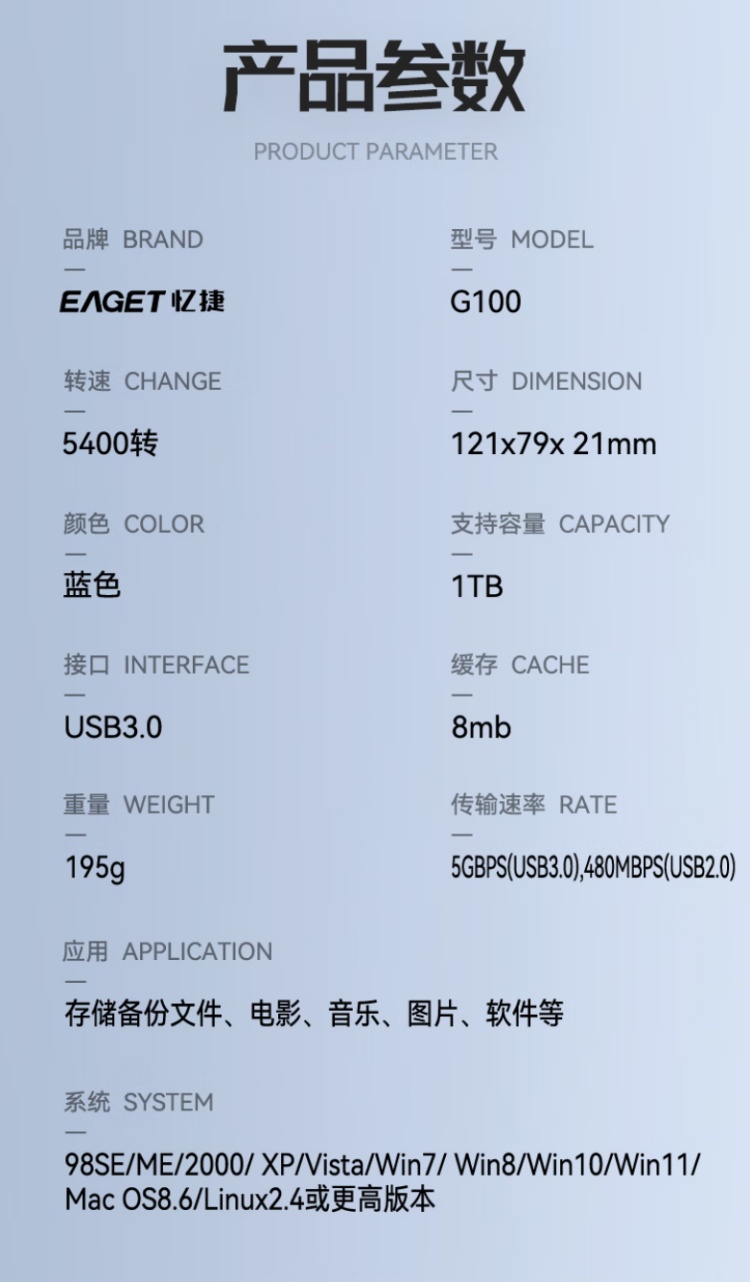 商品属性 [供应商] 苏宁易购集团股份有限公司 [指示灯] 支持 [WIFI功能] 不支持 [加密功能] 不支持 [产品特色] 移动硬盘USB3.0接口2.5英寸 [开票单位] 个 [容量] 1TB [外壳材质] 磨砂金属 [内部接口] SATA接口 [外部接口] USB3.0 [硬盘尺寸] 2.5英寸 [读取速度] 130MB/s [写入速度] 120MB/s [尺寸(长×宽×高)] 121×79×21 [重量] 0.195 [产地] 中国广东深圳市 [型号] G100-1T [硬盘类型] 便携式存储