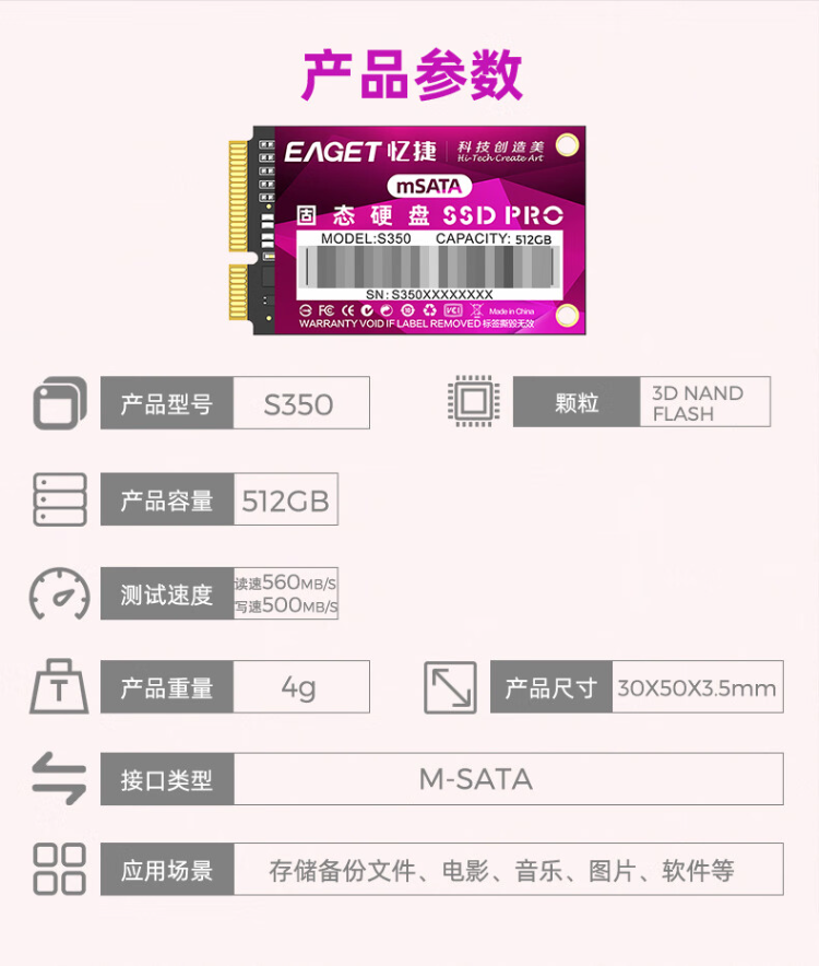 商品属性 [供应商] 苏宁易购集团股份有限公司 [接口类型] SATA接口 [容量] 512GB [读取速度] 560 [特性] M.2 NGFF SATAIII接口 [厚度] 3.5毫米 [开票单位] 个 [型号] S350-512G [系列] 固态硬盘 [上市时间] 2020年7月 [类别] SSD固态硬盘