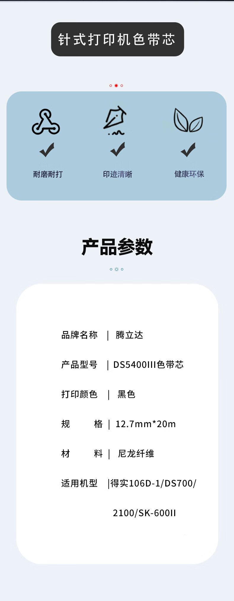 商品属性 [供应商] 得力集团有限公司 [适用主机类型] 针式打印机 [带架规格(mmxm)] 12mm*20m [型号] DS5400III [色带类别] 色带芯 [原装/通用] 通用耗材 [支数] 10支 [适用机型] DPK500