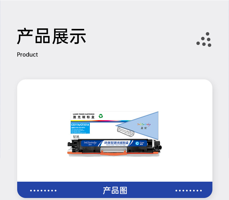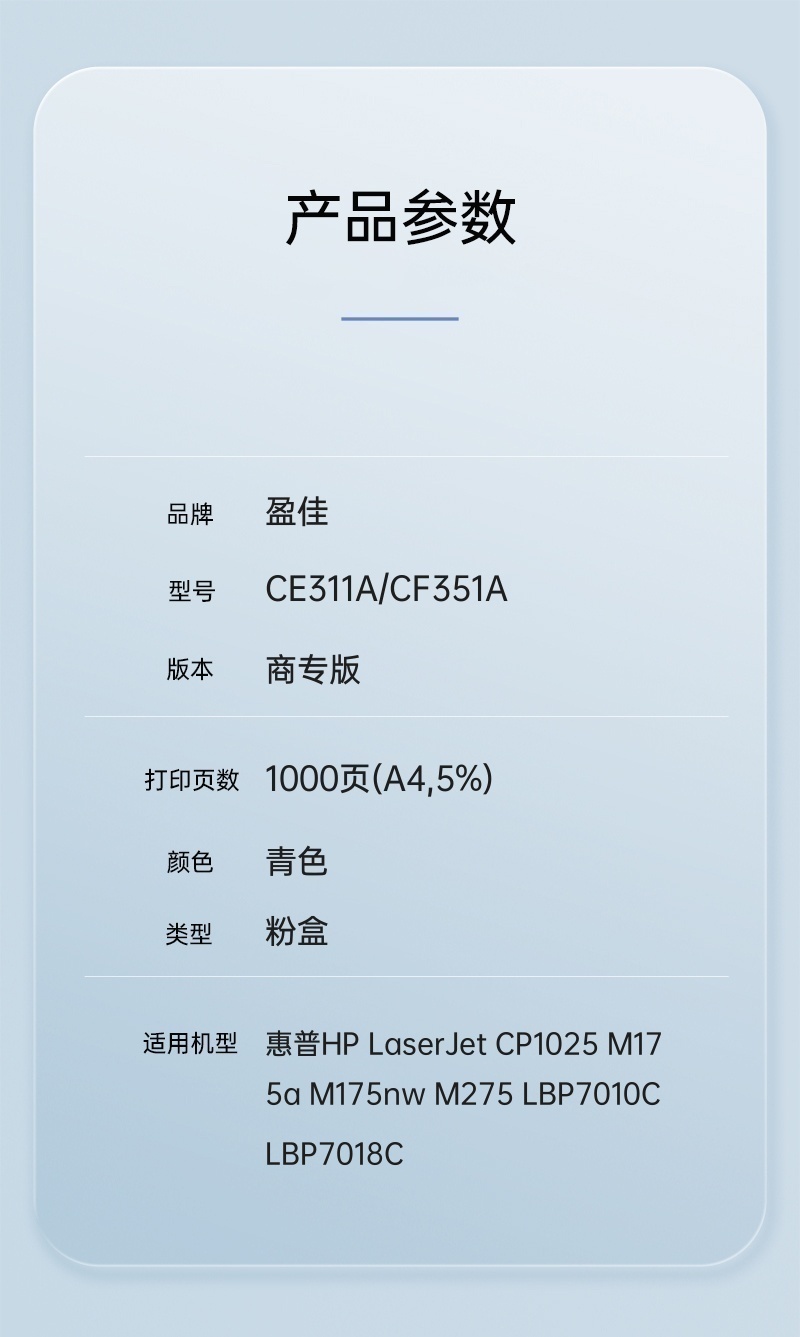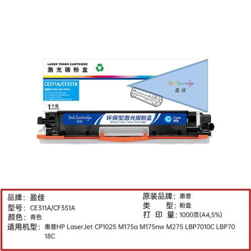 商品属性 [供应商] 深圳市怡亚通供应链股份有限公司 [品牌:] 盈佳(Ink Cartridge) [型号:] CE311A/CF351A [规格:] 商专版 带芯片1000页