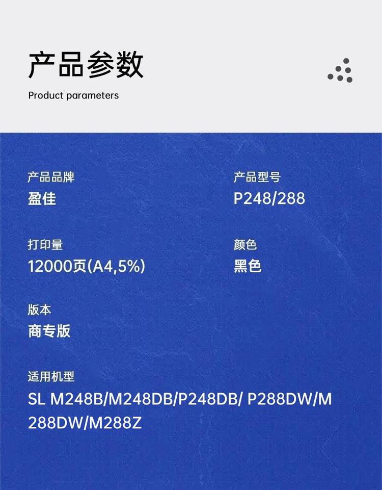 商品属性 [供应商] 深圳市怡亚通供应链股份有限公司 [品牌:] 盈佳(Ink Cartridge) [型号:] P248/288 [规格:] 商专版 12000页