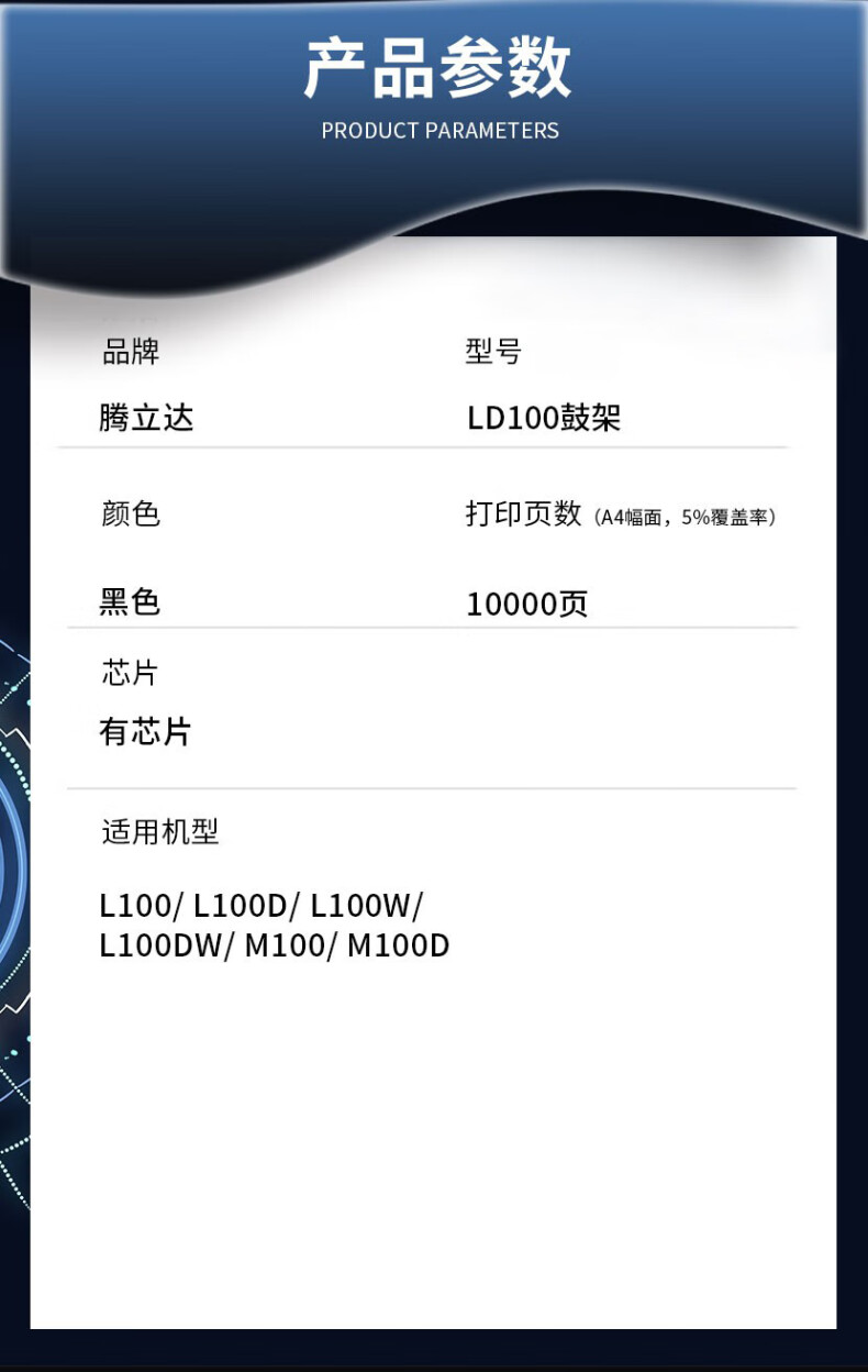 商品属性 [供应商] 得力集团有限公司 [品牌] 腾立达 [型号] LD100 [商品标题] 腾立达LD100鼓架 有芯片 黑色 适用L100/L100D/L100W/ L100DW/ M100/ M100D(单位:个) [销售单位] 个