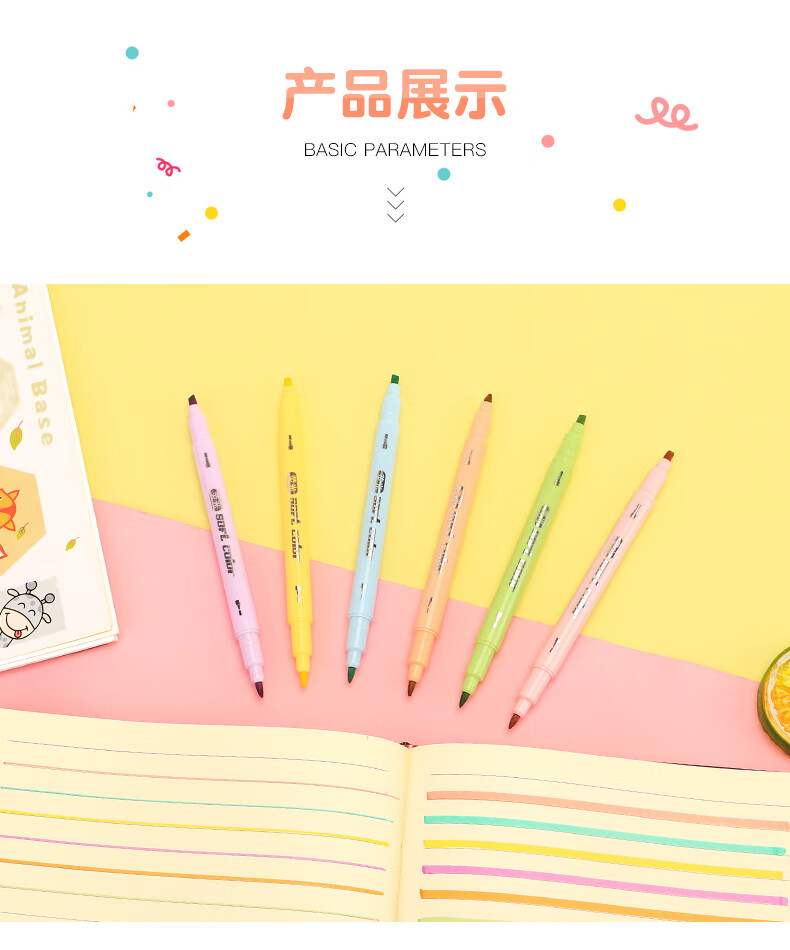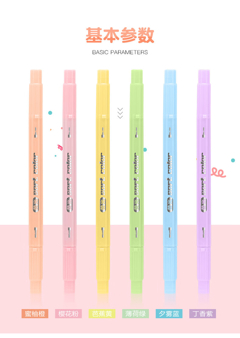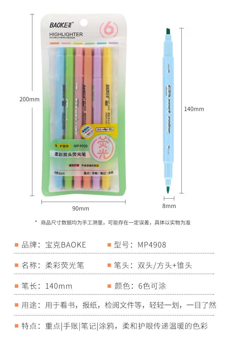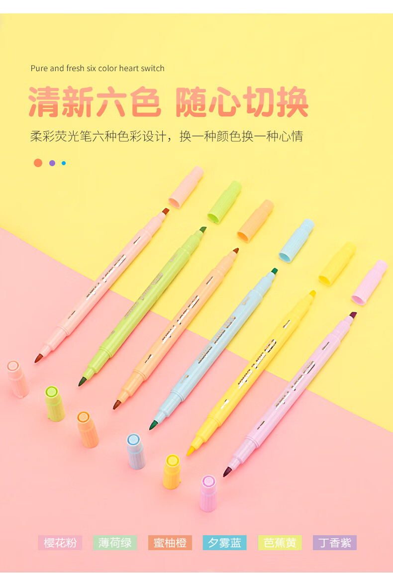 商品属性 [供应商] 德致商成集团有限公司 [产地] 中国 [笔头特性] 圆头,斧头,大小双头 [笔芯颜色] 6色 [笔尖材质] 纤维 [数量] 6支 [包装清单] 荧光笔6支*1 [类型] 水性笔