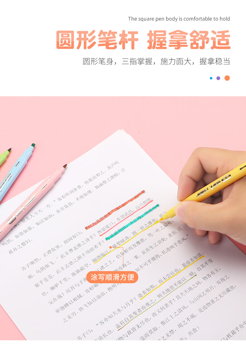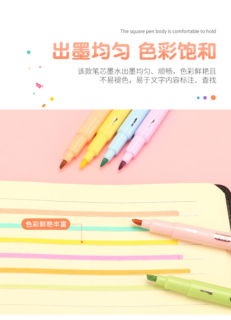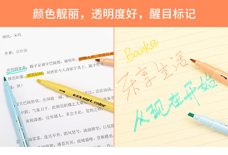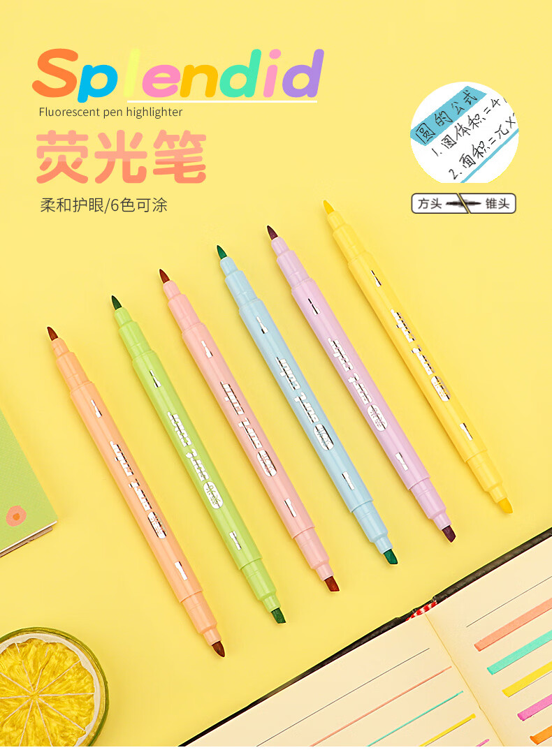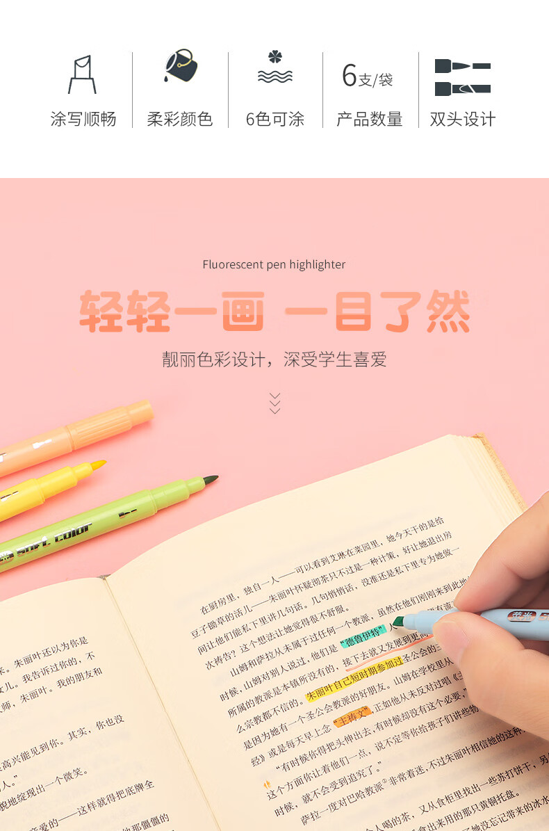 商品属性 [供应商] 德致商成集团有限公司 [产地] 中国 [笔头特性] 圆头,斧头,大小双头 [笔芯颜色] 6色 [笔尖材质] 纤维 [数量] 6支 [包装清单] 荧光笔6支*1 [类型] 水性笔