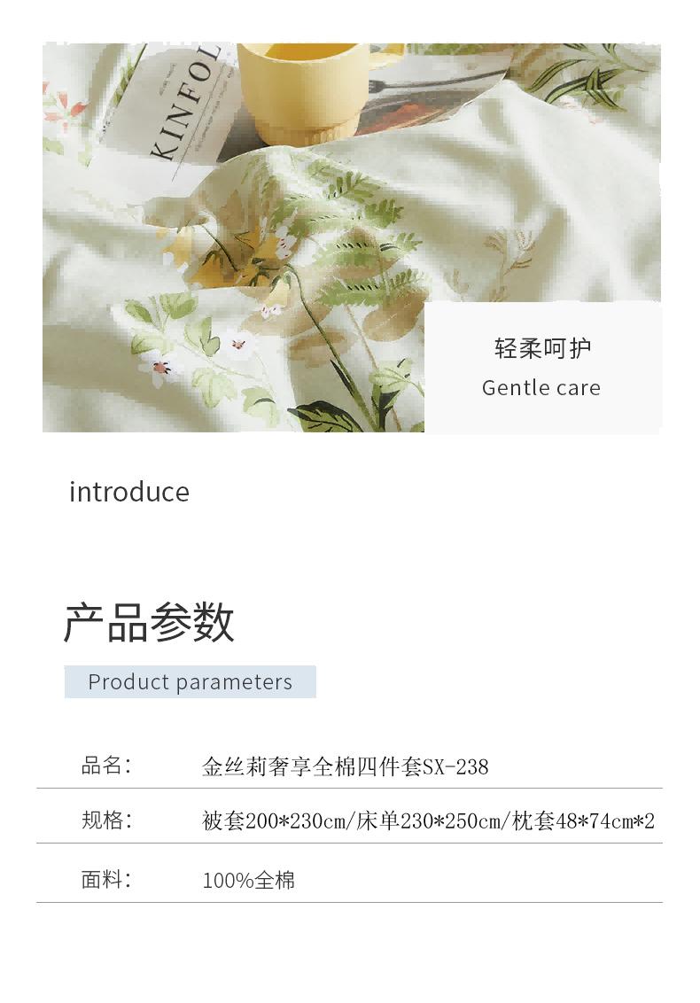 商品属性 [供应商] 深圳市怡亚通供应链股份有限公司 [品牌:] 金丝莉(KINTHERI) [型号:] SX-238 [规格:] 被套200*230cm床单230*250cm枕套48*74cm*2