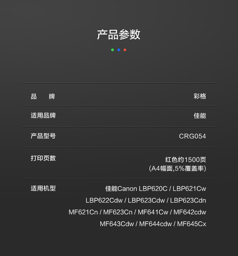 商品属性 [供应商] 得力集团有限公司 [品牌] 彩格(CHGC) [型号] CRG054 [商品标题] 彩格兼容CRG054硒鼓(鼓粉一体)PLUS版红色单支装 (适用佳能LBP621Cw 623Cdn 623Cdw粉盒 MF641Cw MF642cdw MF643Cdw mf645cx)1500页(单位:支) [销售单位] 支