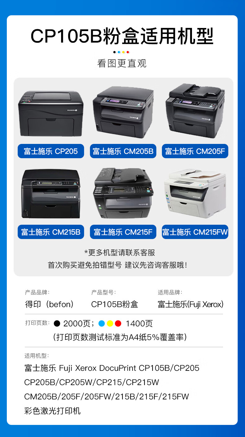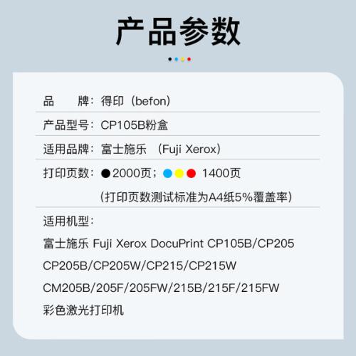 商品属性 [供应商] 德致商成集团有限公司 [打印页数] 2000页 [包装清单] CP105B粉盒黑色*1支 [类别] 粉盒/粉仓 [类型] 通用耗材 [适用机型] 施乐CM215fw/CM215f/CM215b/CM205b/CM205f/CP105b/CP215/w/CP205/w