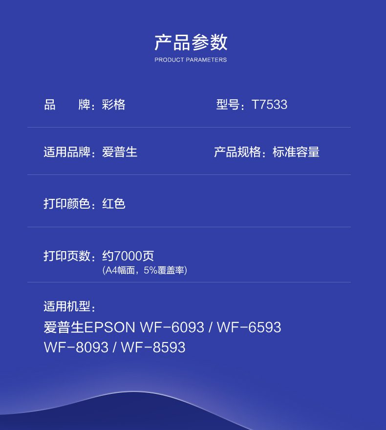 商品属性 [供应商] 德致商成集团有限公司 [主体颜色] 红色 [商品毛重] 200.00g [墨盒型号] T7533 [打印页数] 7000页 [商品产地] 中国大陆 [类别] 不带头墨盒 [类型] 通用耗材 [适用机型] 爱普生EPSON WF-6093;WF-6593;WF-8093;WF-8593;WF-8590