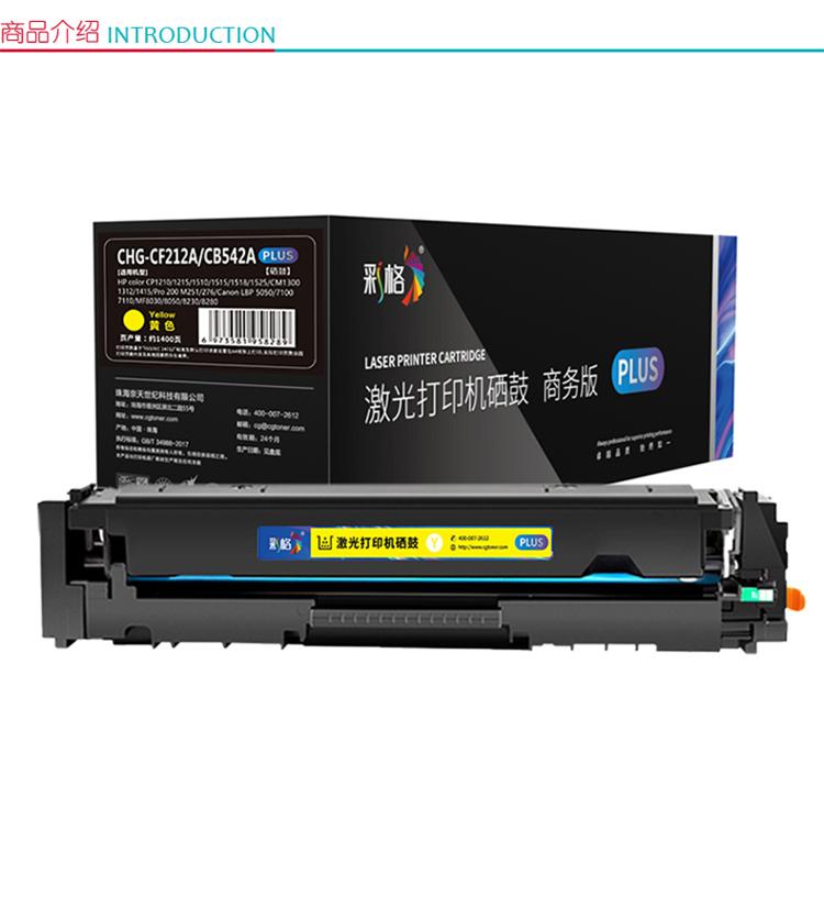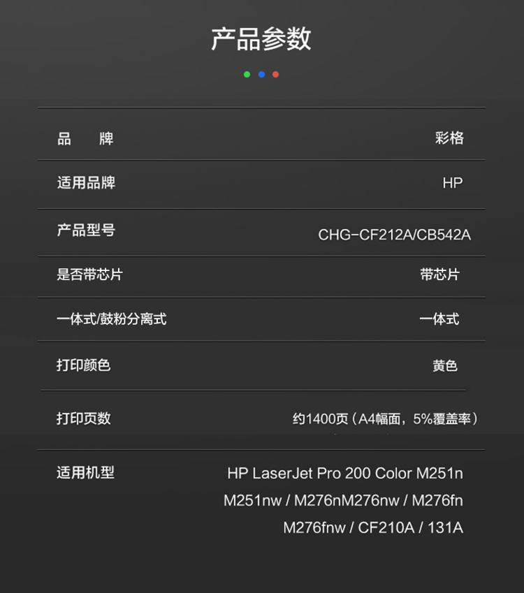 商品属性 [供应商] 深圳齐心集团股份有限公司 [品牌] 彩格 [型号] CHG-CF212A/CB542A [商品毛重] 0.772kg [适用机型] HP LaserJet Pro 200 Color M251n M251nw/M276nM276nw/ M276fn M276fnw/CF210A/131A