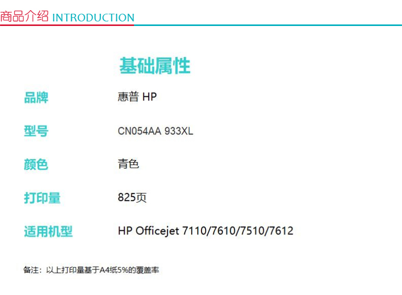 商品属性 [供应商] 科力普科技集团股份有限公司 [产地] 新加坡,马来西亚,中国 [打印量] 825页 [适用机型] HP Officejet 7110/7610/7510/7612 [品牌] 惠普 [型号] CN054AA 933XL