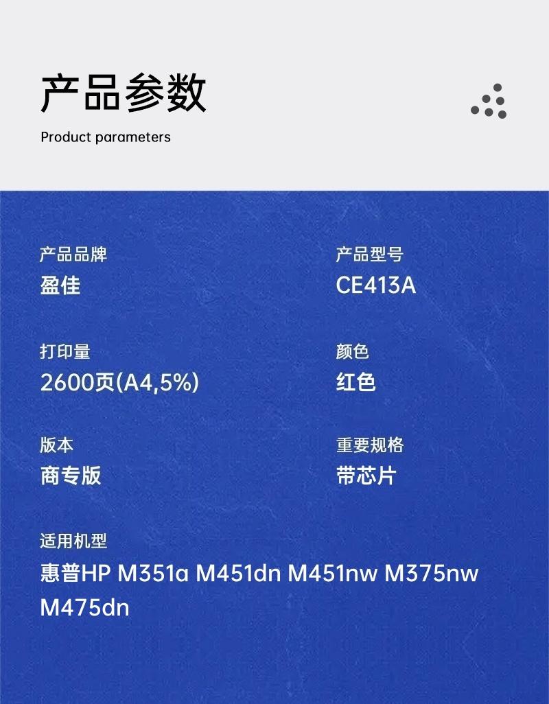 商品属性 [供应商] 深圳市怡亚通供应链股份有限公司 [品牌:] 盈佳(Ink Cartridge) [型号:] 商专版 CE413A [规格:] 2600页