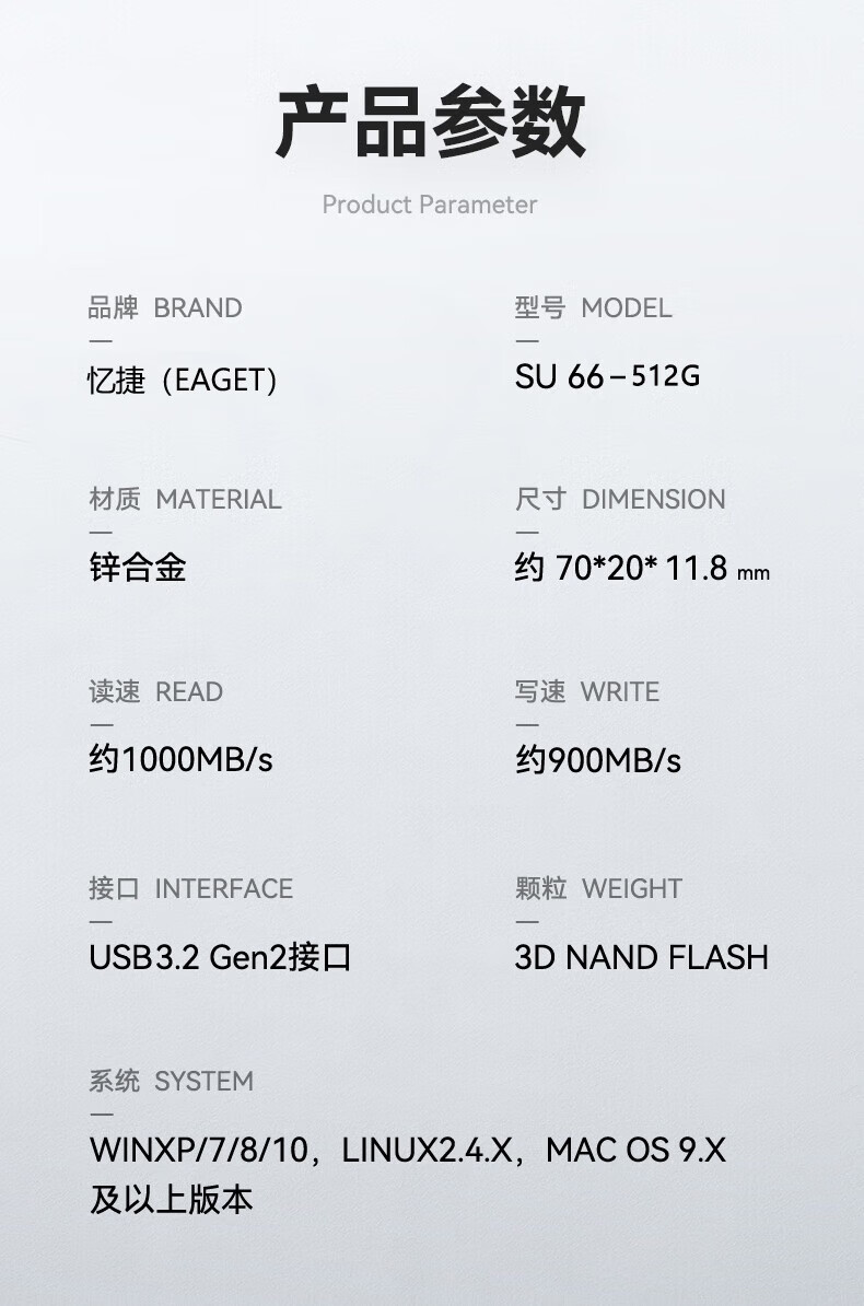 商品属性 [供应商] 北京京东世纪信息技术有限公司 [产品尺寸] 长70mm;宽20mm;高11.8mm [系列] SU66 [型号] SU66-512G [U盘含资源包] 裸盘 [钥匙孔] 无钥匙孔 [产品净重] 23.8g [最大读取速度] 1000MB/s [最大写入速度] 900MB/s