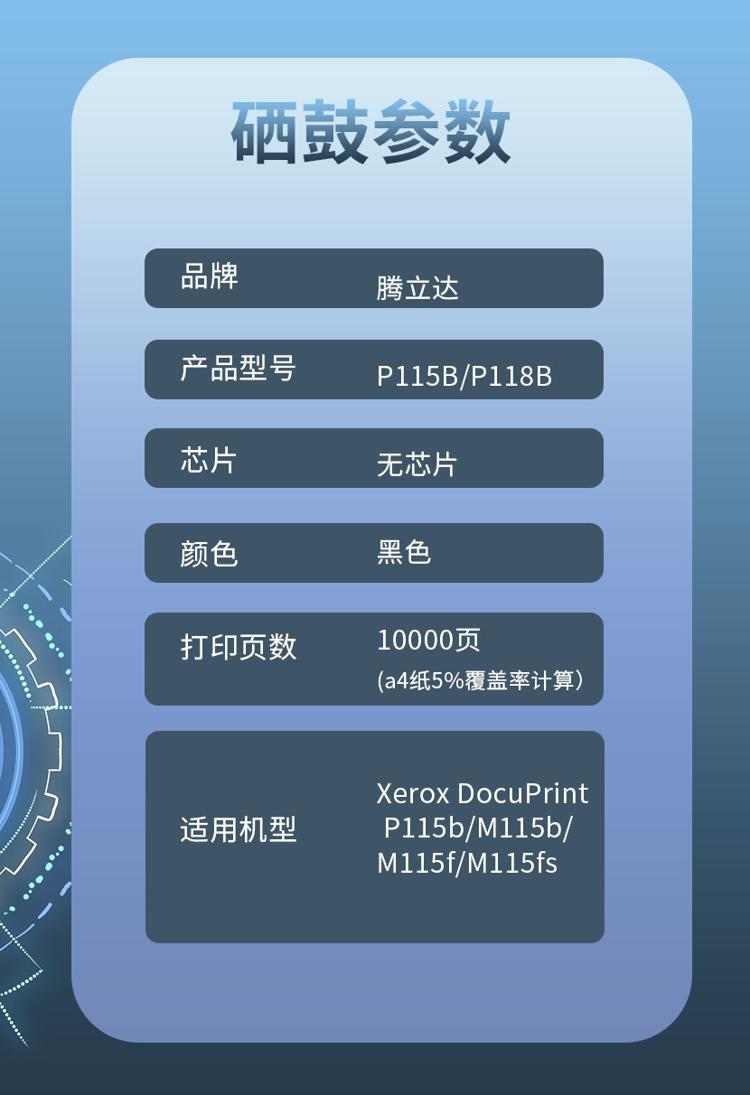 商品属性 [供应商] 深圳齐心集团股份有限公司 [品牌] 腾立达 [型号] P115B/P118B [类别] 成像鼓 [原装/通用] 通用耗材 [是否带芯片] 不带芯片 [总打印页数] 10000页