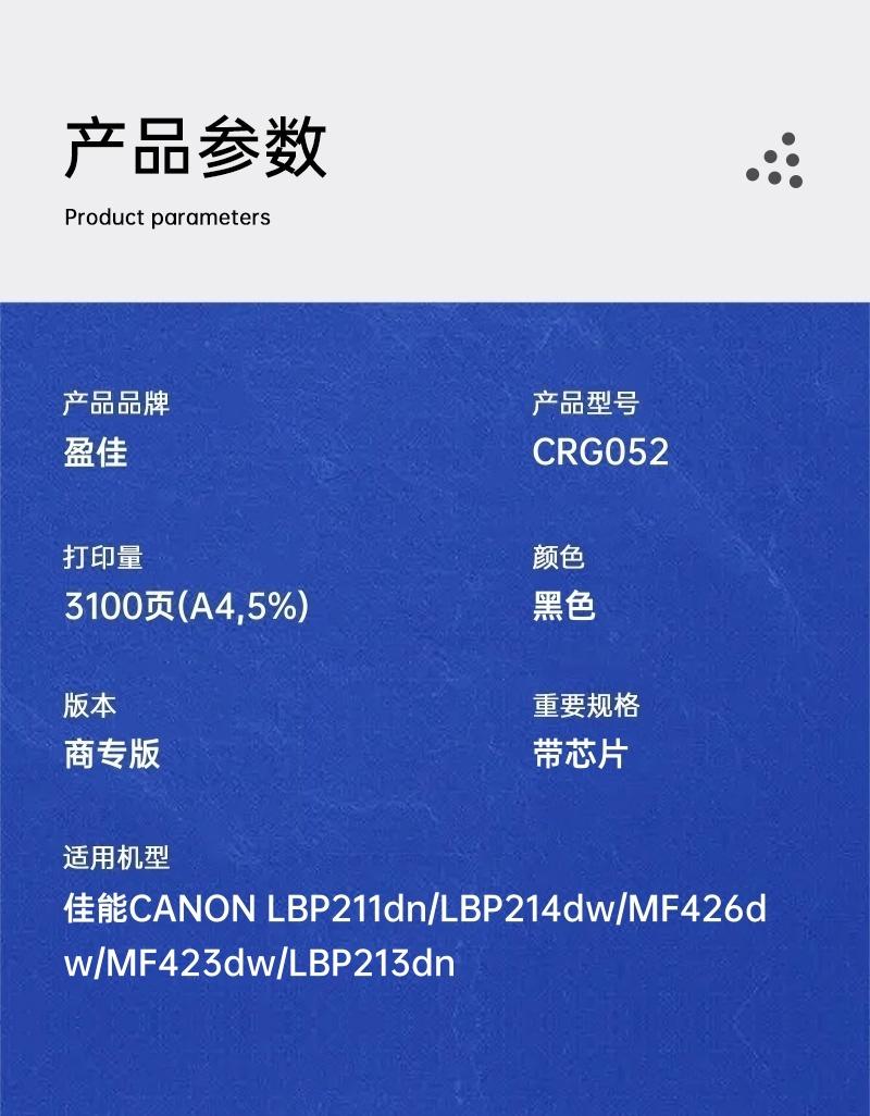 商品属性 [供应商] 深圳市怡亚通供应链股份有限公司 [品牌:] 盈佳(Ink Cartridge) [型号:] 商专版 CRG052 [规格:] 3100页