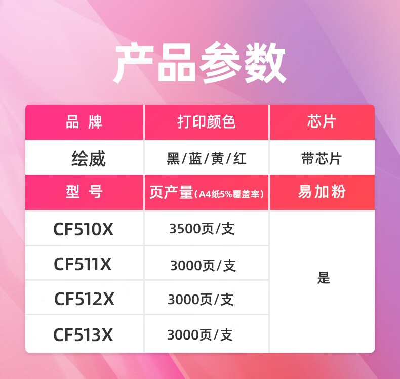 商品属性 [供应商] 深圳市怡亚通供应链股份有限公司 [品牌:] 绘威 [型号:] CF510X [规格:] 打印页数3000页