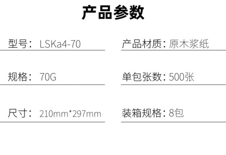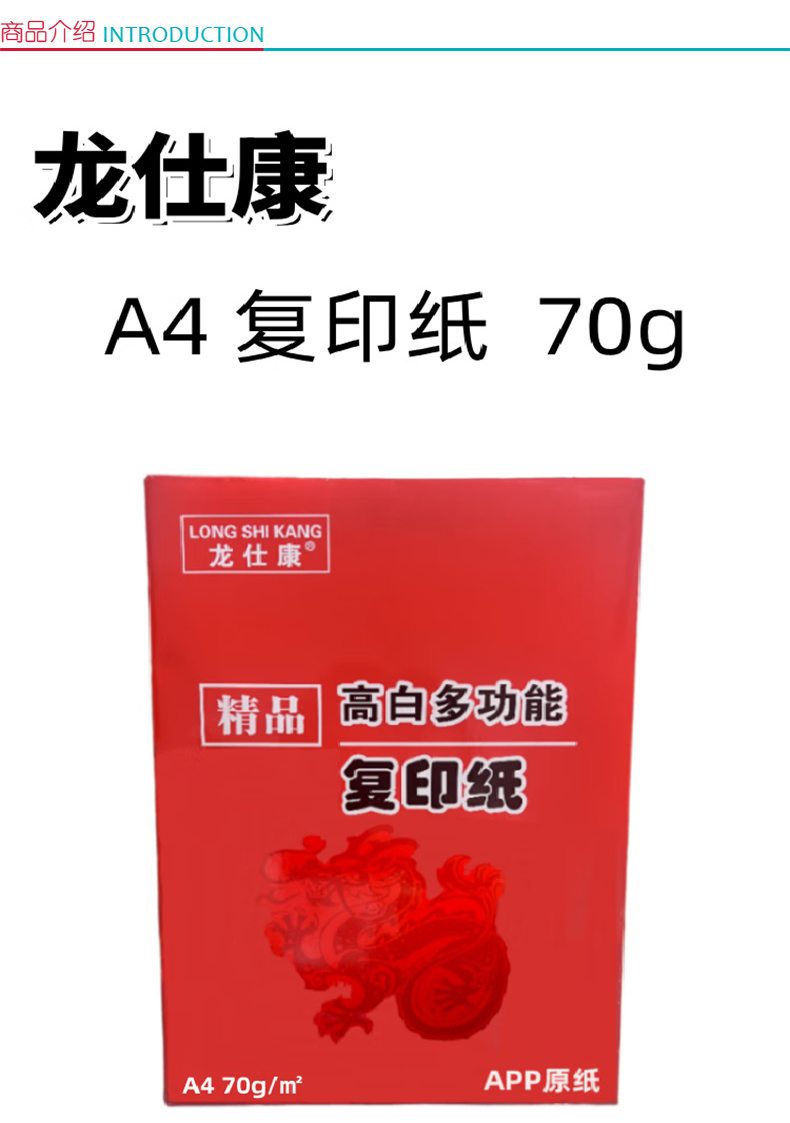 商品属性 [供应商] 科力普科技集团股份有限公司 [纸质] 木浆 [入数] 8包 [商品毛重] 18kg [克重] 70g [包装规格] A4 70g 500张/包8包/箱 [品牌] 龙仕康 [型号] LSKa4708