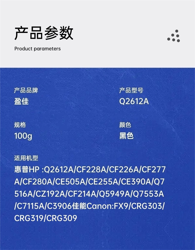 商品属性 [供应商] 科力普科技集团股份有限公司 [适用机型] 适用机型:惠普HP :Q2612A/CF228A/CF226A/CF277 [打印量] 100G [品牌] 盈佳 [型号] Q2612A