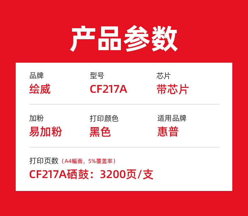商品属性 [供应商] 深圳市怡亚通供应链股份有限公司 [品牌:] 绘威 [型号:] CF217A [规格:] 易加粉 带芯片 打印页数3200页