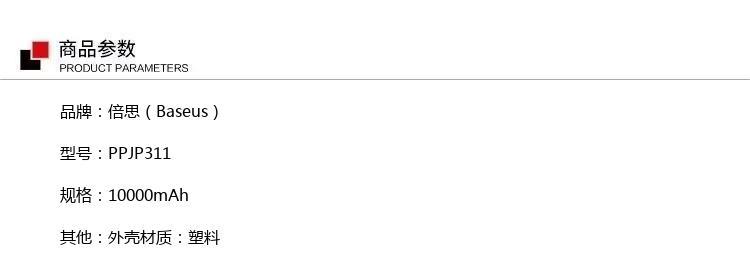 商品属性 [供应商] 深圳齐心集团股份有限公司 [品牌] 倍思(Baseus) [型号] PPJP311 [外壳材质] 塑料