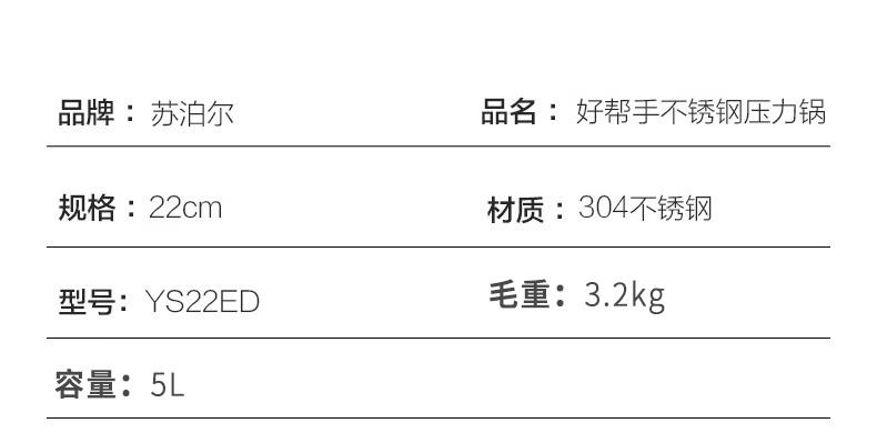 商品属性 [供应商] 深圳市怡亚通供应链股份有限公司 [品牌:] 苏泊尔(SUPOR) [型号:] YS22ED [规格:] 5L