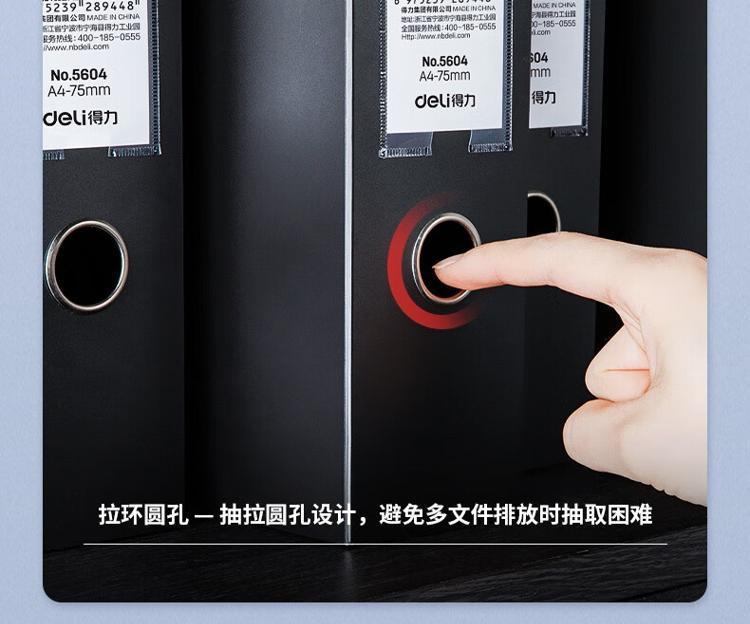 商品属性 [供应商] 深圳齐心集团股份有限公司 [品牌] 得力(deli) [型号] 5604 [尺寸] 239*317*75mm [背宽] 75mm [材质] PP [内包装] 36个/箱