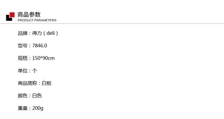 商品属性 [供应商] 深圳齐心集团股份有限公司 [品牌] 得力(deli) [型号] 7846 [类型] 悬挂式 [是否附带白板架] 否