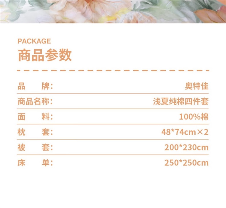 商品属性 [供应商] 科力普科技集团股份有限公司 [床上用品_面料] 棉 [床上用品_规格] 被套:200*230cm 床单:250*250cm 枕套:48*74cm*2 [品牌] 奥特佳 [型号] 001-020173