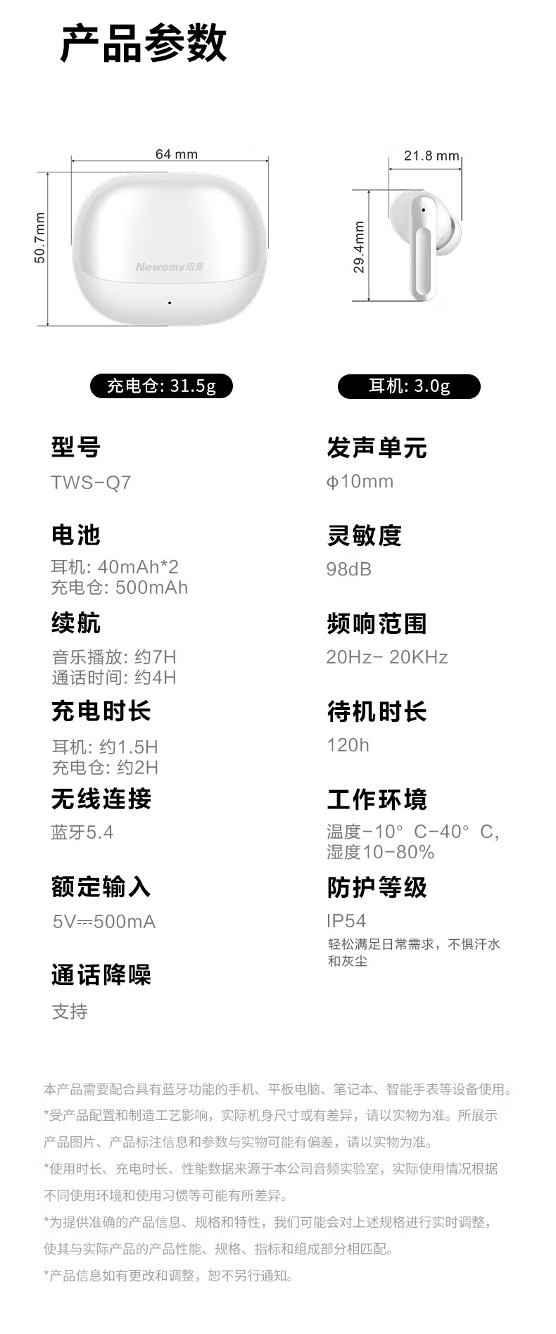 商品属性 [供应商] 苏宁易购集团股份有限公司 [型号] TWS-Q7 [类型] 无线耳机 [耳机频响范围] 20Hz-20KHz [耳机阻抗] 32 [是否有线控] 无线控 [是否内置麦克风] 是 [耳机灵敏度] 98 [最大承载功率] 5 [插头直径] 3.5mm [佩戴方式] 入耳式 [产地] 中国江苏南京市