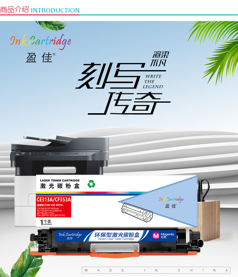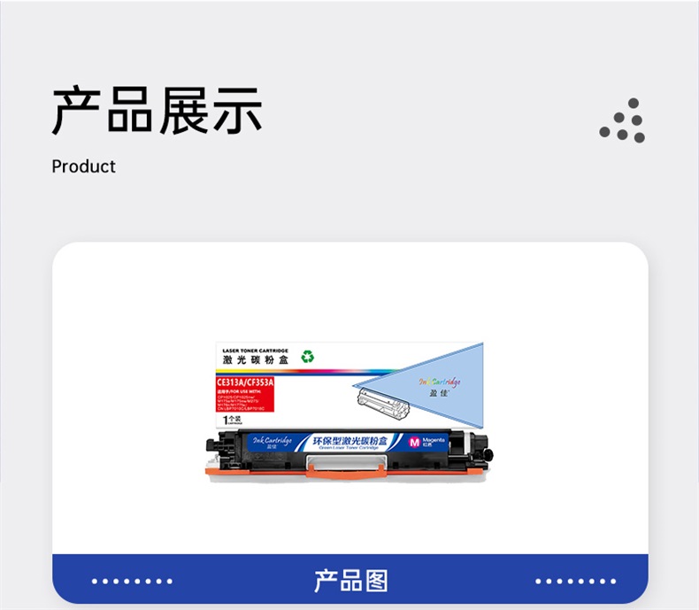 商品属性 [供应商] 科力普科技集团股份有限公司 [打印量] 1000页 [适用机型] 适用机型: 惠普HP LaserJet CP1025 M175a M175nw M275 [商品毛重] 0.9kg [品牌] 盈佳 [型号] CE313A/CF353A