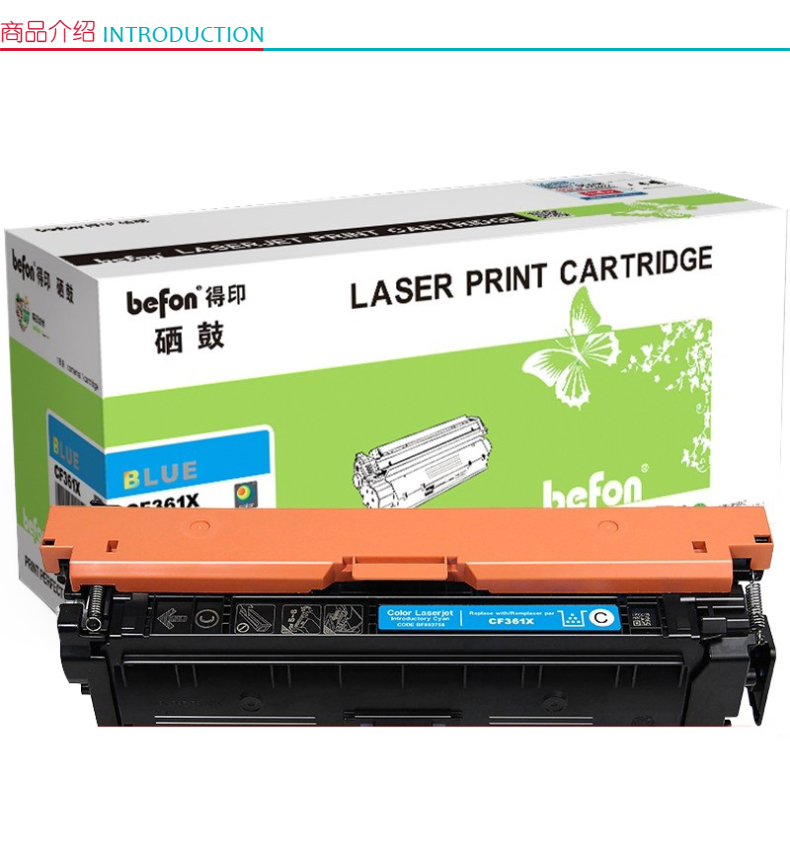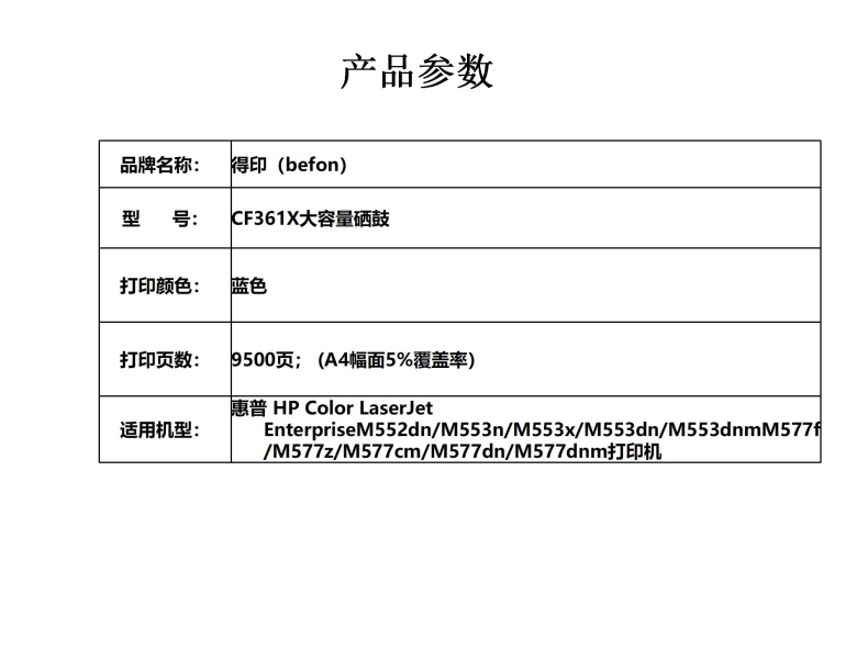 商品属性 [供应商] 科力普科技集团股份有限公司 [商品毛重] 1170克 [适用机型] 惠普 HP Color LaserJet EnterpriseM552dn/M553n/M553x/M553dn/M553dnmM577f /M577z/M577cm/M577dn/M577dnm打印机 [打印量] 9500页 [品牌] 得印 [型号] CF361X