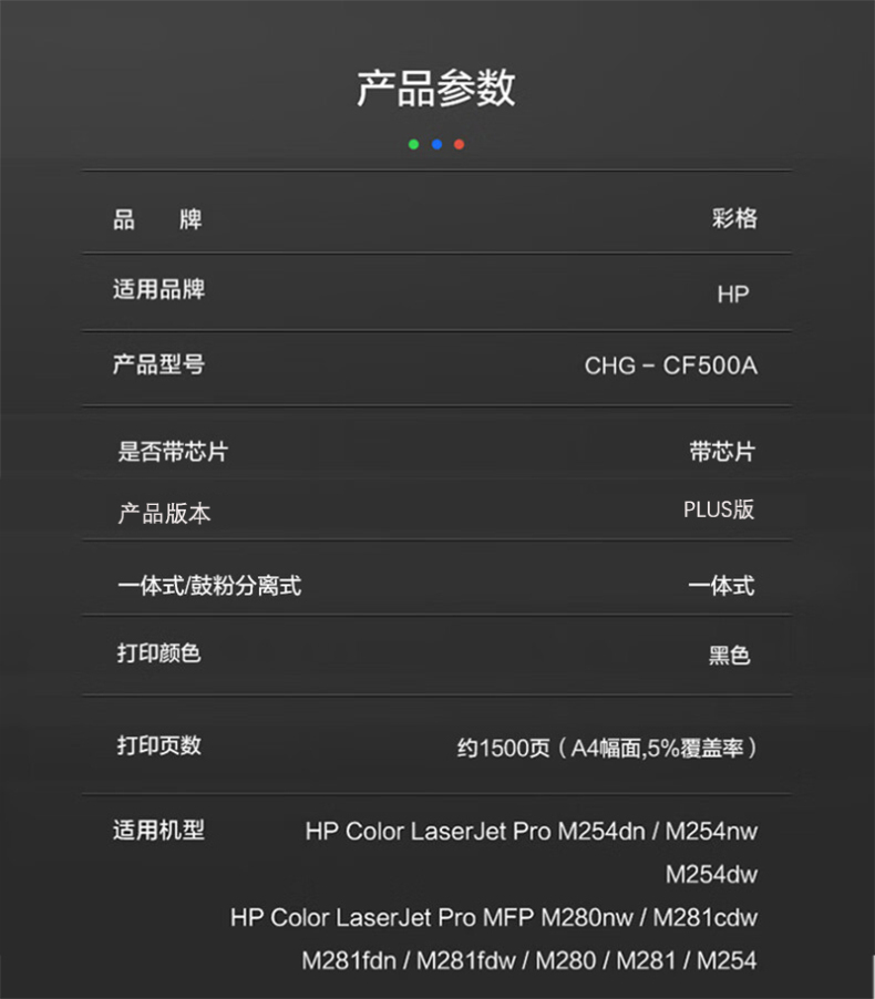 商品属性 [供应商] 科力普科技集团股份有限公司 [打印量] 约1500页 [商品毛重] 1.1kg [适用机型] 适用机型:HP Color LaserJet Pro M254dn /M254nw [品牌] 彩格 [型号] CHG-CF500A
