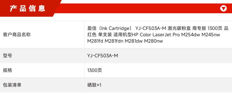 商品属性 [供应商] 史泰博(上海)有限公司 [品牌] 盈佳(Ink Cartridge) [型号] YJ-CF503A-M