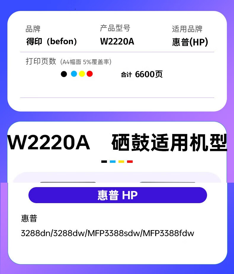 商品属性 [供应商] 北京京东世纪信息技术有限公司 [是否带芯片] 带芯片 [硒鼓型号] W2220A [总打印页数] 6600页