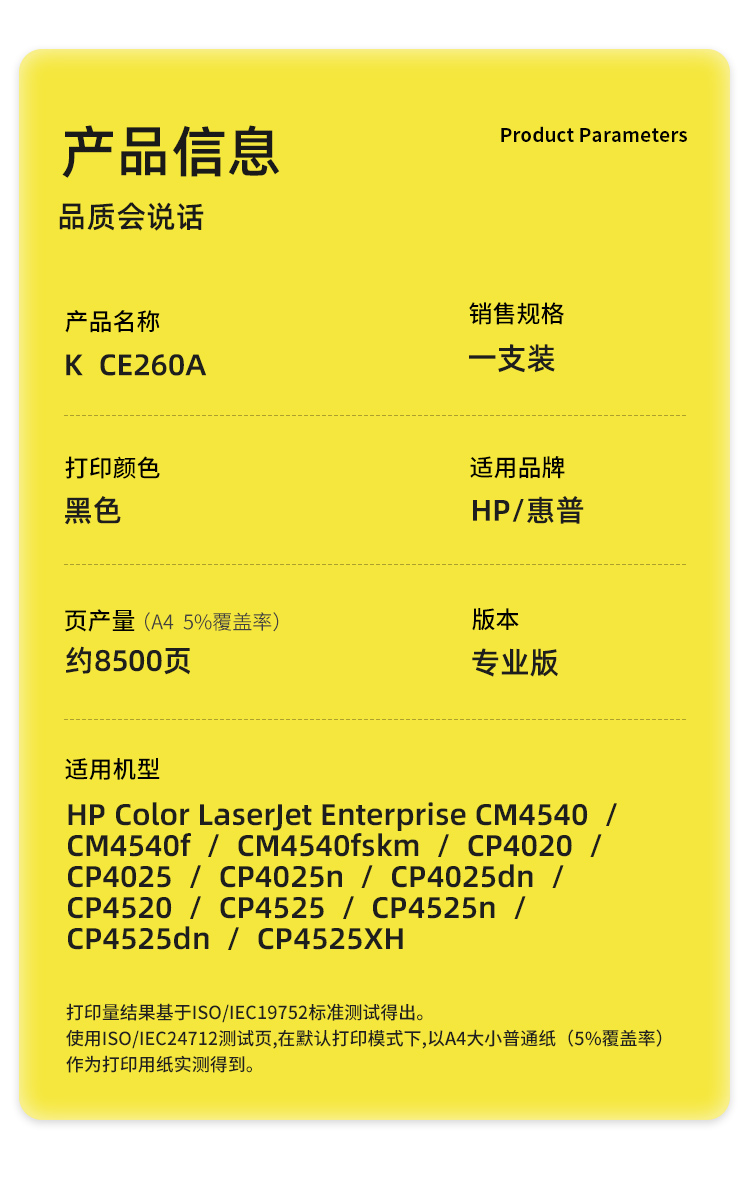 商品属性 [供应商] 得力集团有限公司 [品牌] 科思特 [型号] K CE260A [版本] 专业版 [打印页数] 8500页 [适用机型] HP Color LaserJet Enterprise CM4540/CM4540f/M4540fskm/CP4020/CP4025/CP4025n/P4025dn/CP4520/CP4525/CP4525n/CP4525dn/CP4525XH