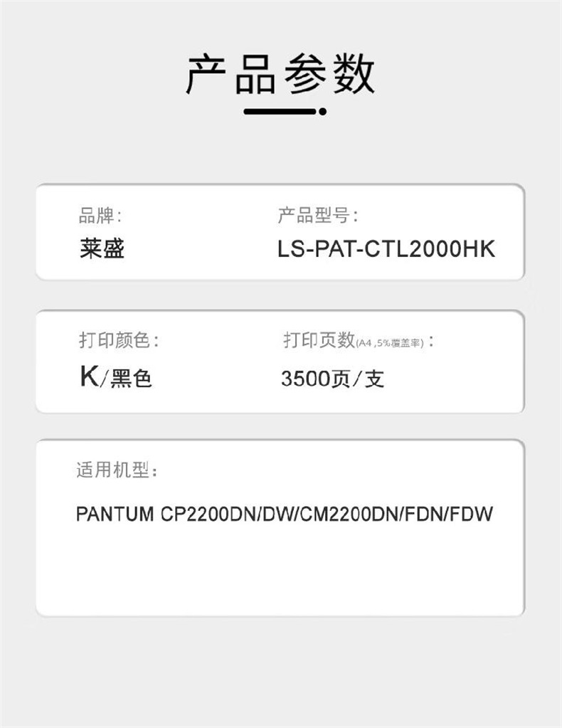 商品属性 [供应商] 科力普科技集团股份有限公司 [品牌] 莱盛 [型号] LS-PAT-CTL2000HK [打印量] 3500页 [适用机型] 适用PANTUM CP2200DN/DW/CM2200DN/FDN/FDW