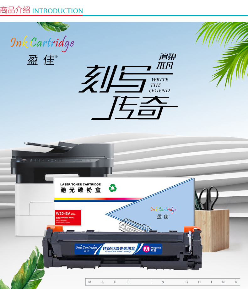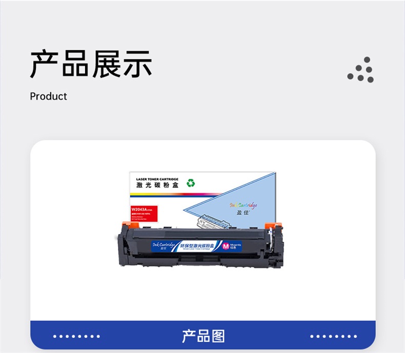 商品属性 [供应商] 科力普科技集团股份有限公司 [打印量] 2100页 [商品毛重] 0.9kg [适用机型] 适用机型: 惠普 HP Color LaserJet Pro M454nw/dn/dw [品牌] 盈佳 [型号] W2043A 416A