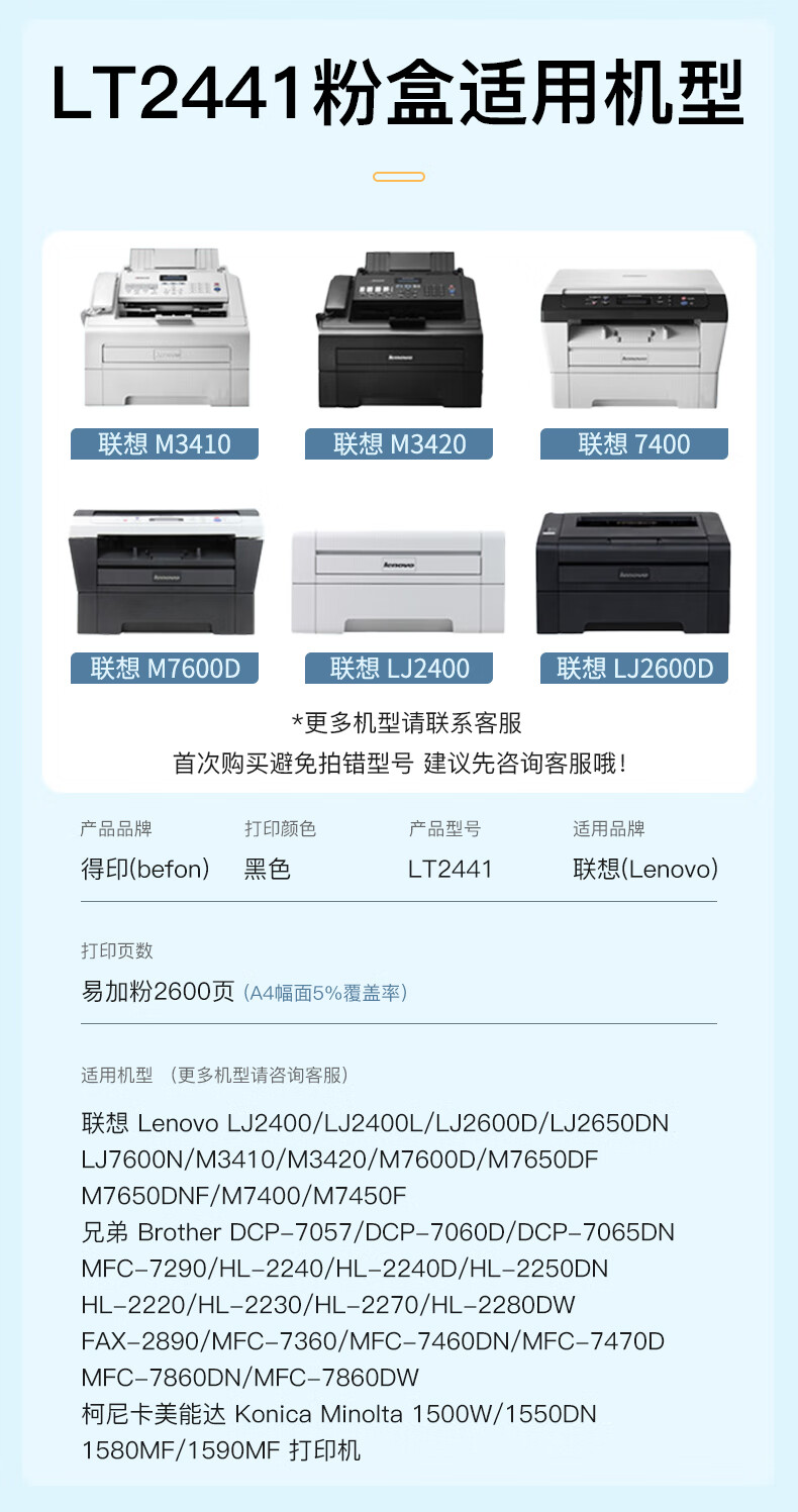 商品属性 [供应商] 德致商成集团有限公司 [打印页数] 2600页 [类别] 粉盒/粉仓 [类型] 通用耗材 [适用机型] LJ2600D/M7400/M7600D/M7650DF/M7650DNF/TN2215/TN2252(联想)