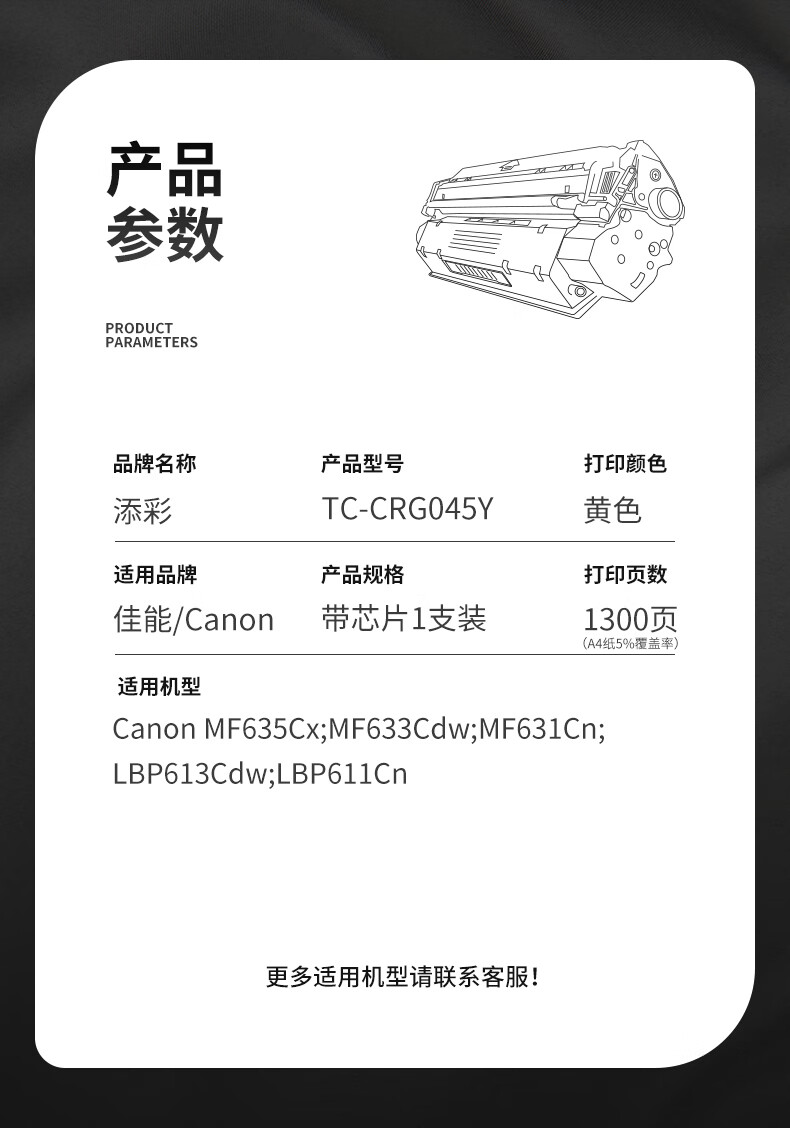 商品属性 [供应商] 德致商成集团有限公司 [打印页数] 1300页 [打印量] 1300页 [原装/通用] 通用耗材 [包装清单] 粉盒x1,产品说明书x1 [类别] 粉盒/粉仓 [类型] 通用耗材 [适用机型] 佳能MF635Cx MF633Cdw MF631Cn LBP613Cdw LBP611Cn