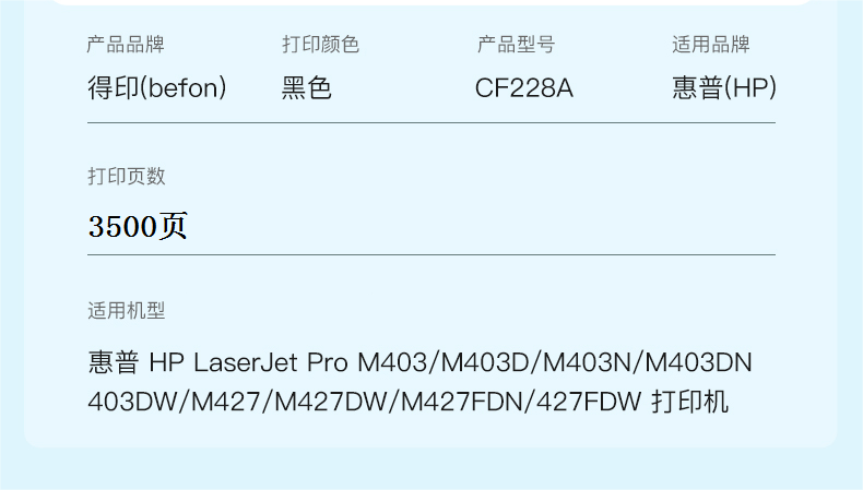 商品属性 [供应商] 深圳市怡亚通供应链股份有限公司 [品牌:] 得印(befon) [型号:] CF228A [规格:] 易加粉 3500页