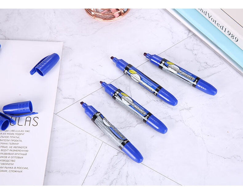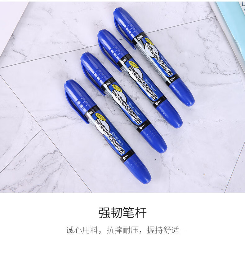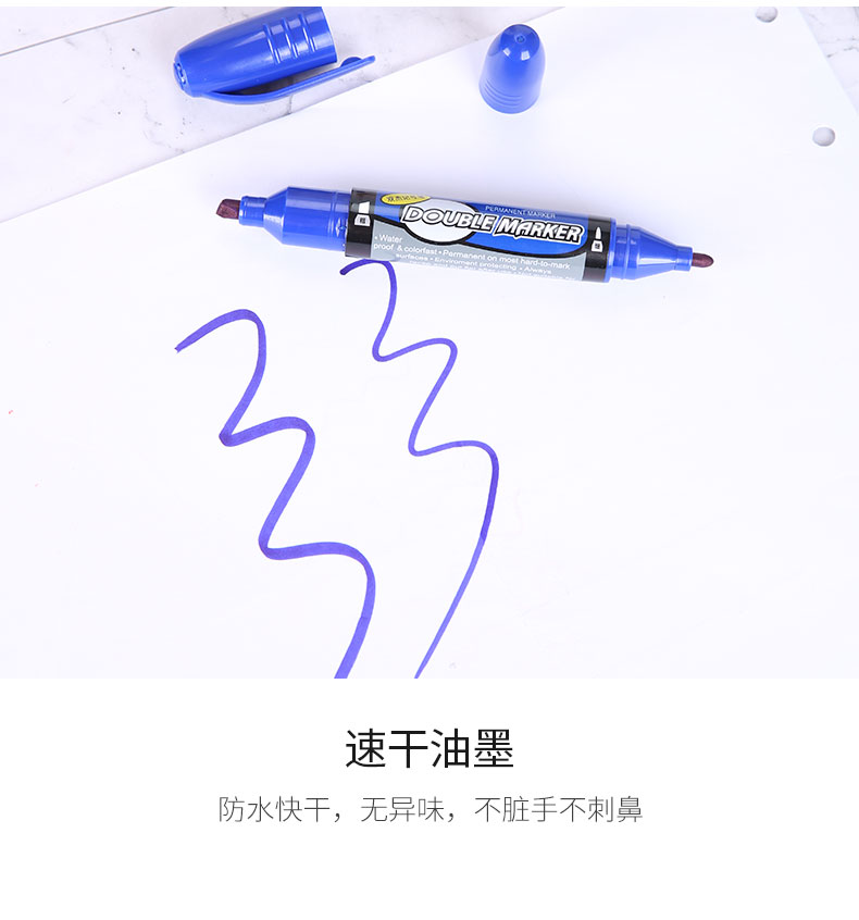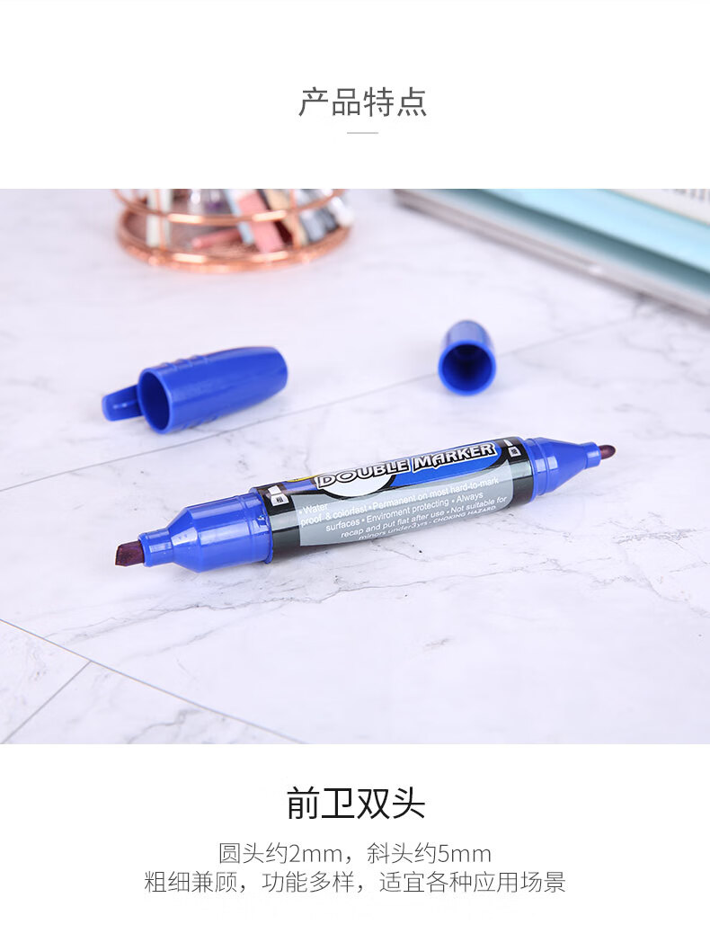 商品属性 [供应商] 德致商成集团有限公司 [产地] 中国 [笔芯颜色] 蓝色 [笔头特性] 双头 [适用场景] 商务 [笔尖材质] 纤维 [书写粗细] 其他 [包装形式] 纸盒装 [支数] 12支 [商品产地] 中国 [数量] 12支 [是否可加墨] 不可加墨 [包装清单] 12支装 [闭合方式] -- [类型] 油性笔