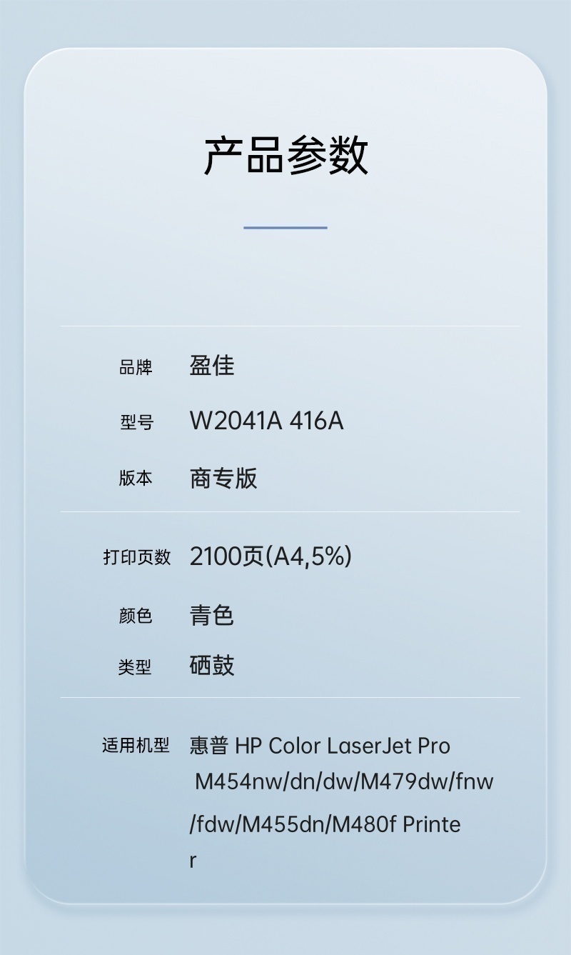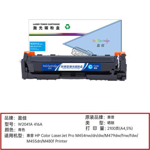 商品属性 [供应商] 深圳市怡亚通供应链股份有限公司 [品牌:] 盈佳(Ink Cartridge) [型号:] W2041A 416A [规格:] 商专版 带芯片2100页