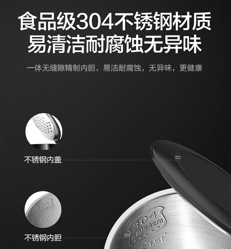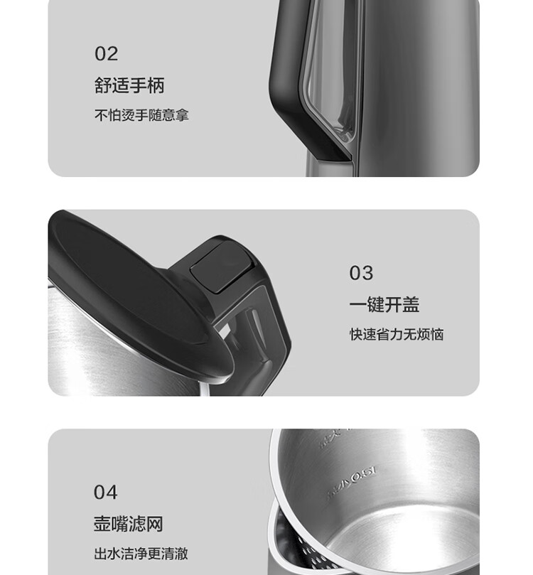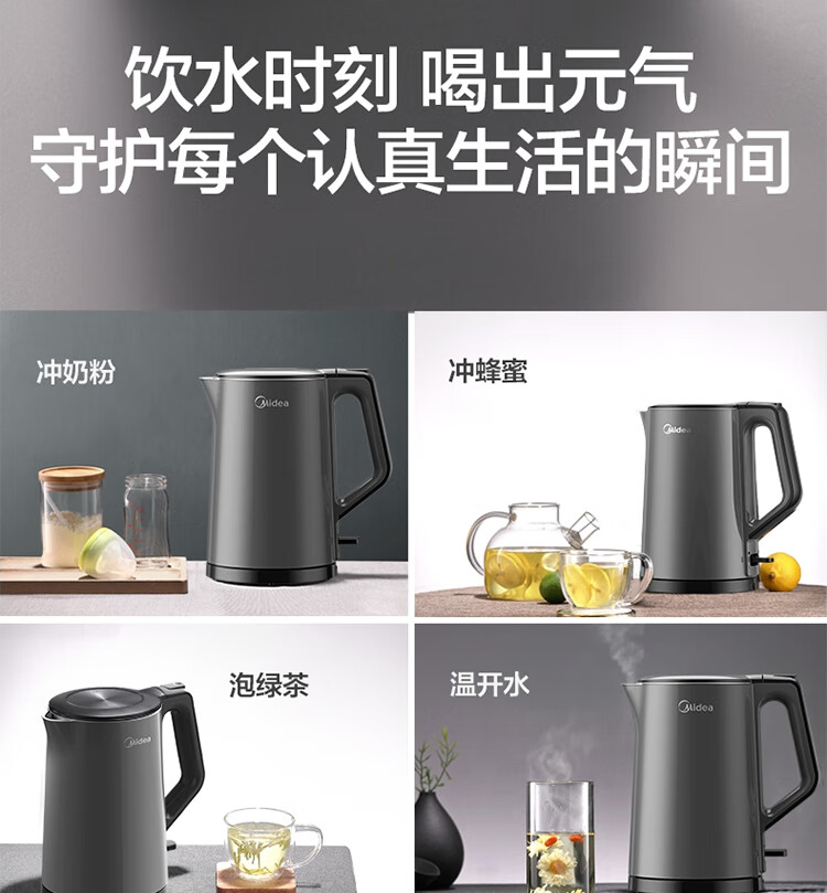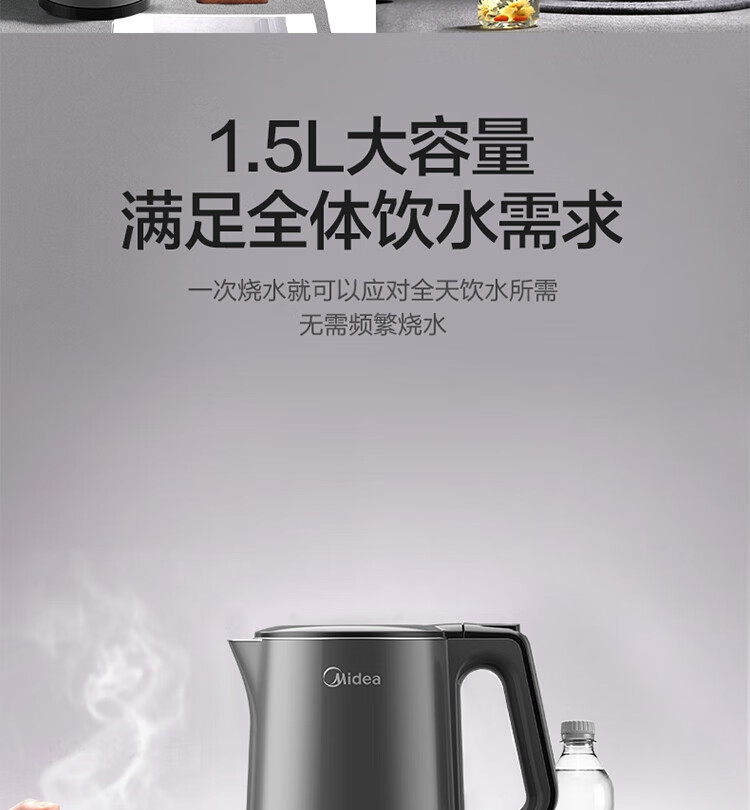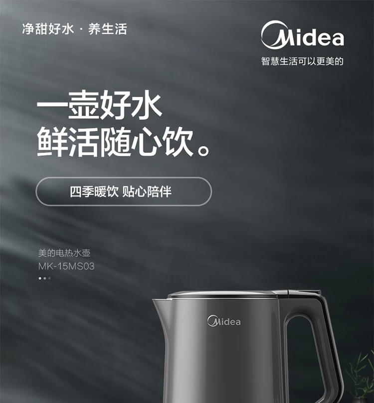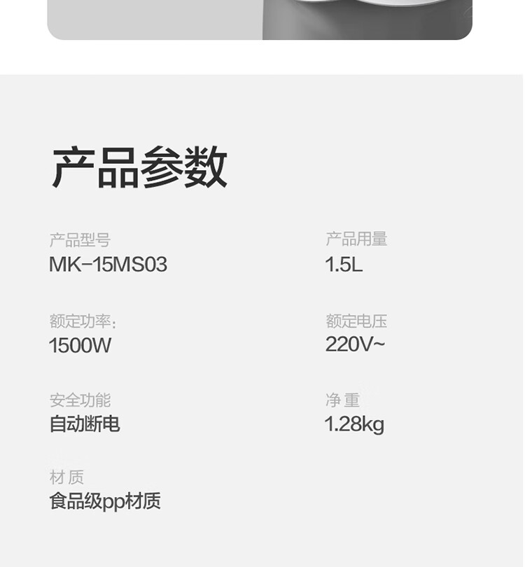 商品属性 [供应商] 北京京东世纪信息技术有限公司 [品牌] 美的(Midea) [壶体密封方式] 无缝一体式 [型号] MK-15MS03 [额定功率] 1500W [特征特质] 双层防烫 [内置配件] 无配件 [CCC强制性认证] 是 [电源线长] 0.8m [产品净重] 1.01kg [组合样式] 单壶 [功能] 自动断电防干烧 [额定电压] 220V [材质] 外塑内钢 [开盖方式] 弹盖 [认证型号] MK-15MS03 [上水方式] 无自动上水功能 [容量] 1.5L [类型] 电热水壶