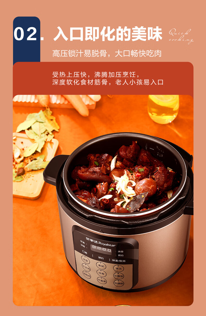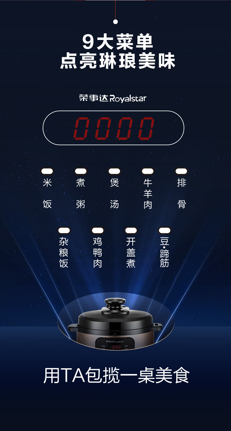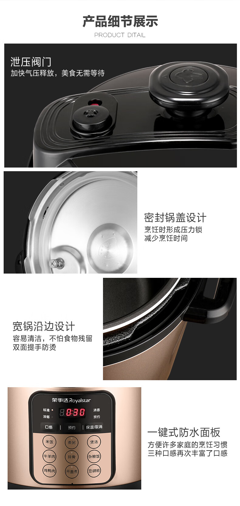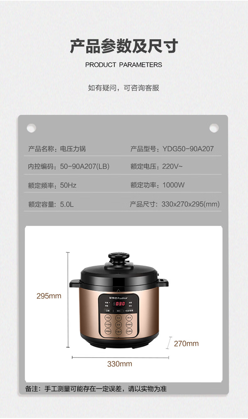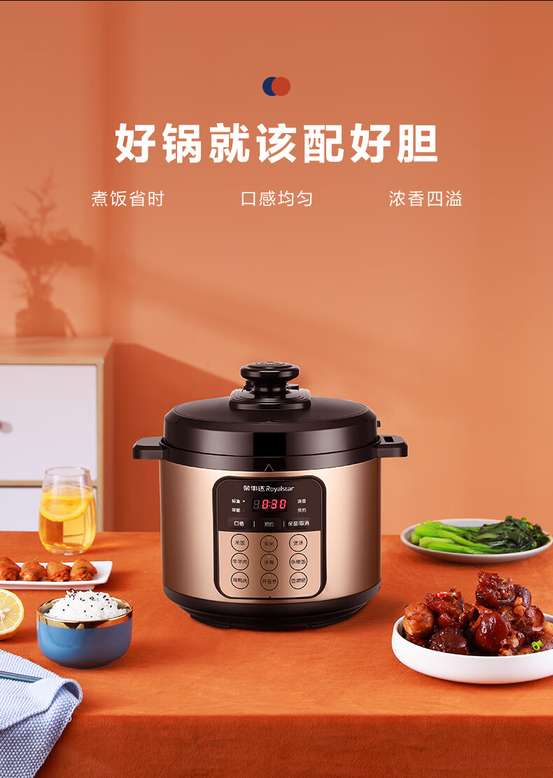 商品属性 [供应商] 得力集团有限公司 [品牌] 荣事达(Royalstar) [型号] YDG50-90A207(LB) [额定功率] 1000W [容量] 5L