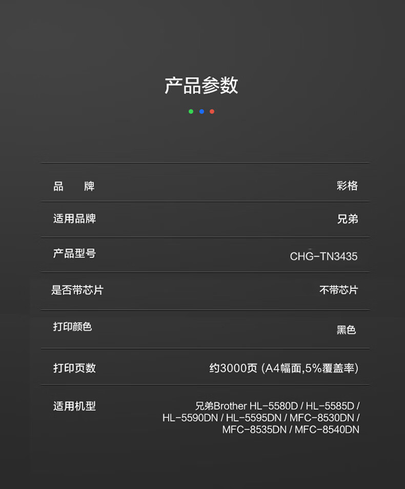 商品属性 [供应商] 德致商成集团有限公司 [打印页数] 3000 [类型] 通用耗材 [适用机型] 适用兄弟5590dn粉盒TN3435粉盒MFC-8535DN/8530DN HL-5580D/5585DN打印机