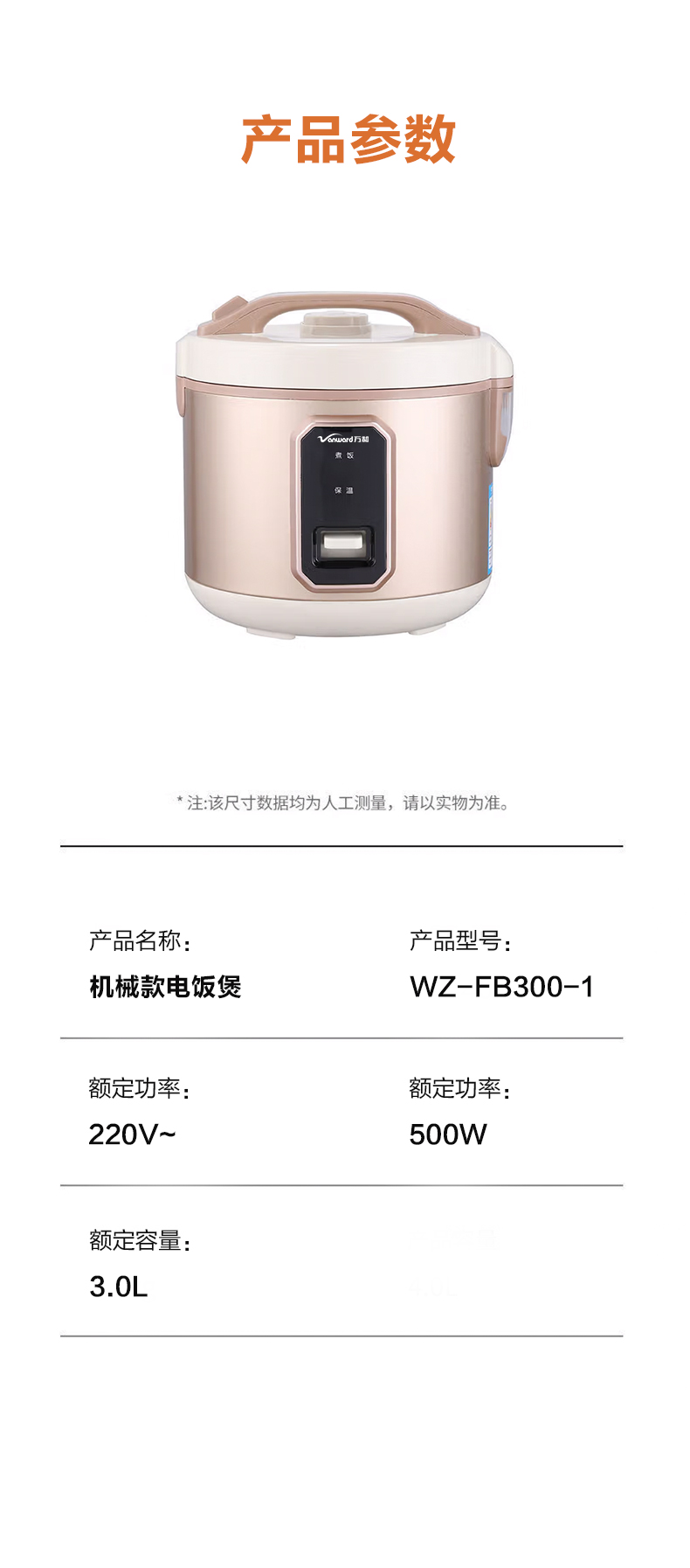 商品属性 [供应商] 得力集团有限公司 [品牌] 万和(Vanward) [型号] WZ-FB300-1 [商品标题] 万和(Vanward)多功能西施煲机械款3L WZ-FB300-1(单位:个) [销售单位] 个